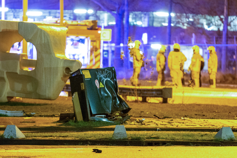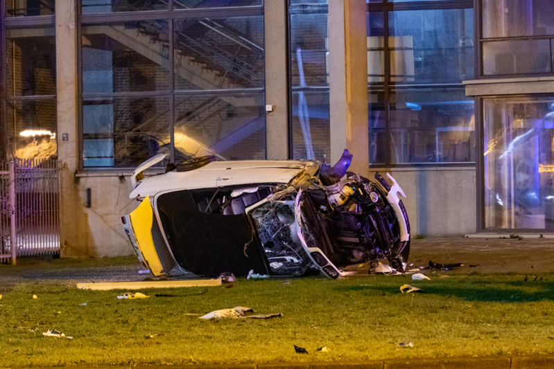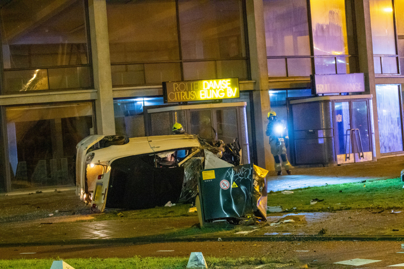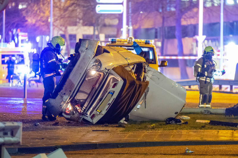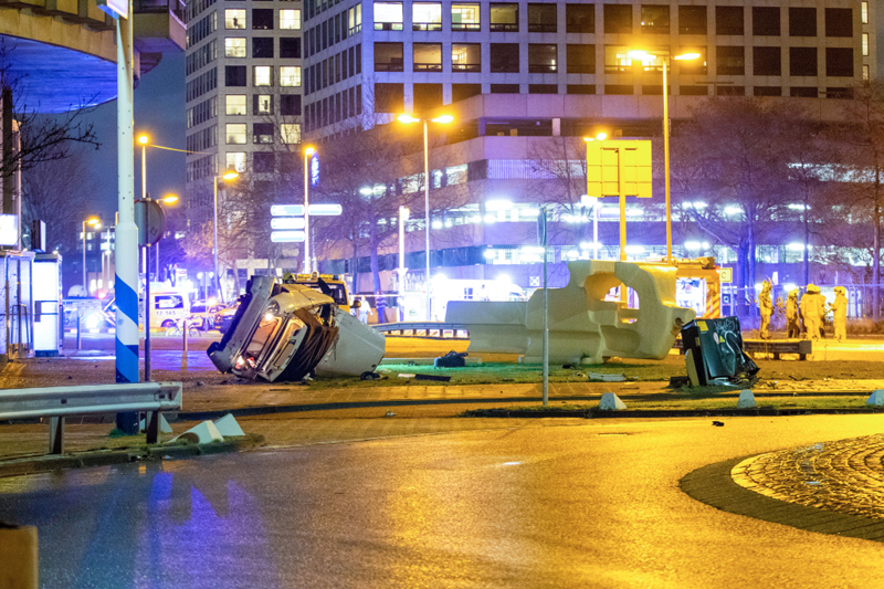 De auto is uit de richting van de Galileistraat met een zeer hoge snelheid over de rotonde gevlogen en uiteindelijk tegen een kunstwerk tot stilstand gekomen. Hierbij is een hogedruk gasleiding geraakt. De ravage is enorm. Tenminste één persoon is gewond geraakt en per ambulance naar het ziekenhuis vervoerd. Een mogelijk tweede slachtoffer is ter plaatse aan zijn verwondingen behandeld.