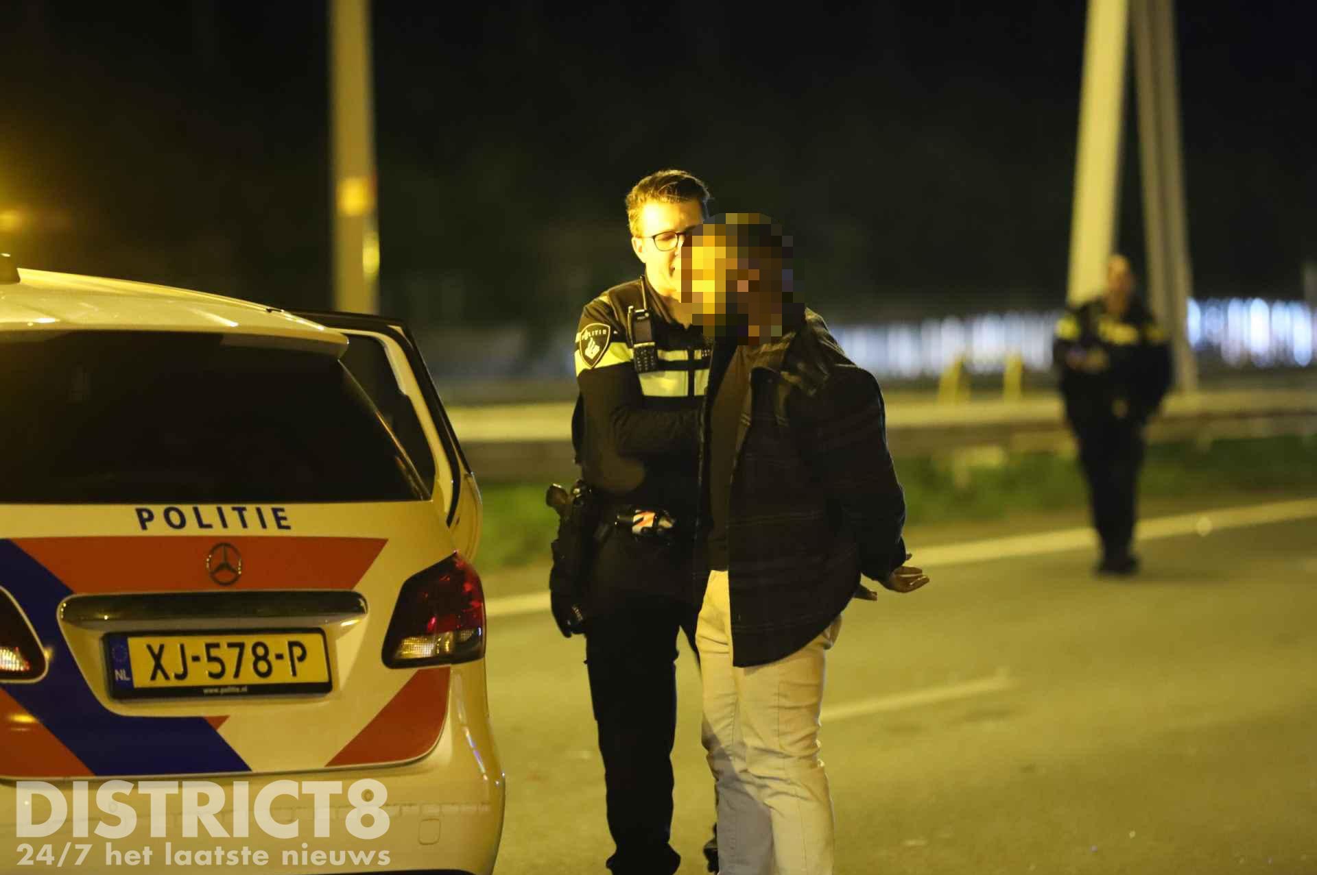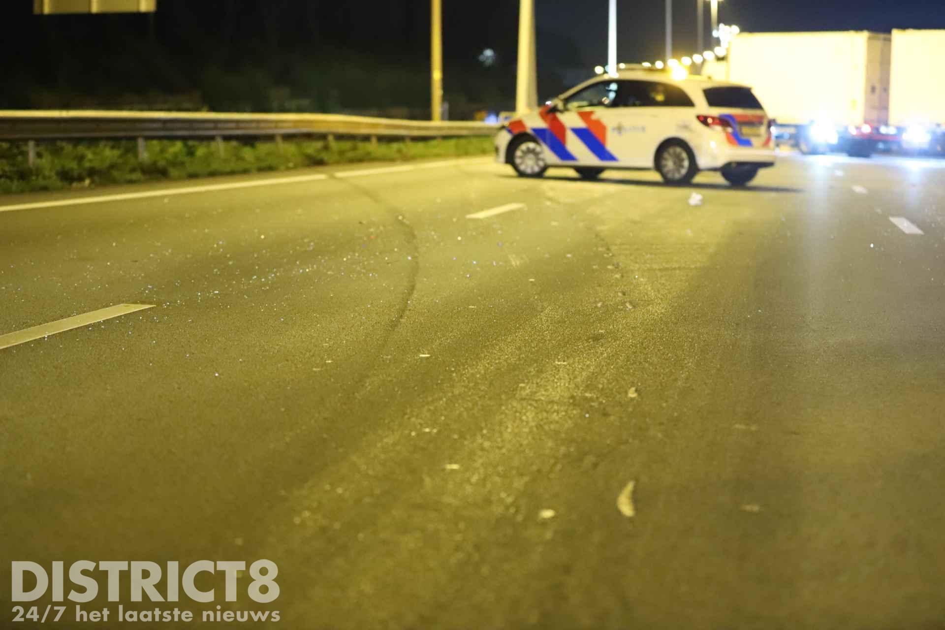 De volledige snelweg lag bezaaid met brokstukken. Een persoon is aangehouden, het is nog onduidelijk waarvoor.