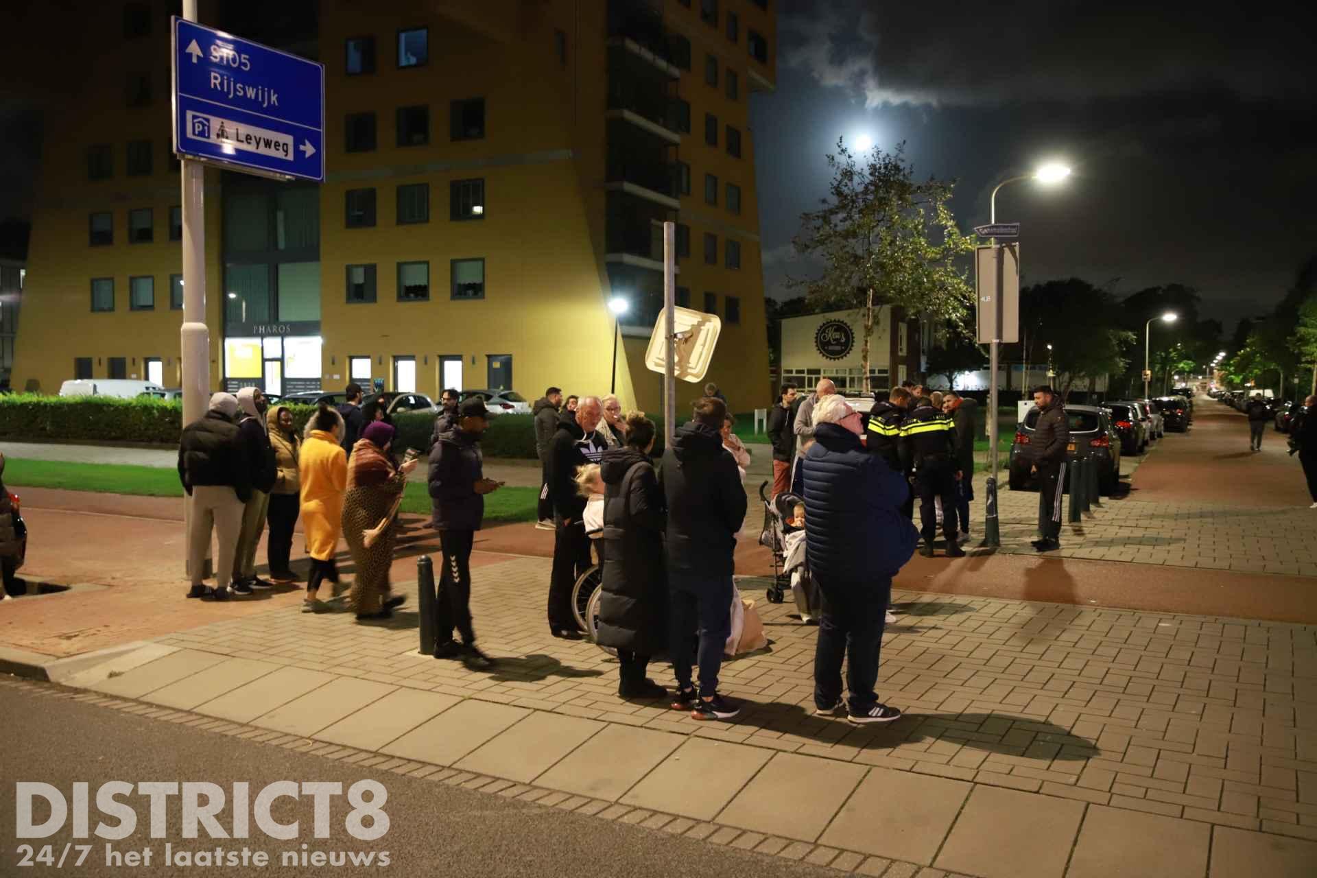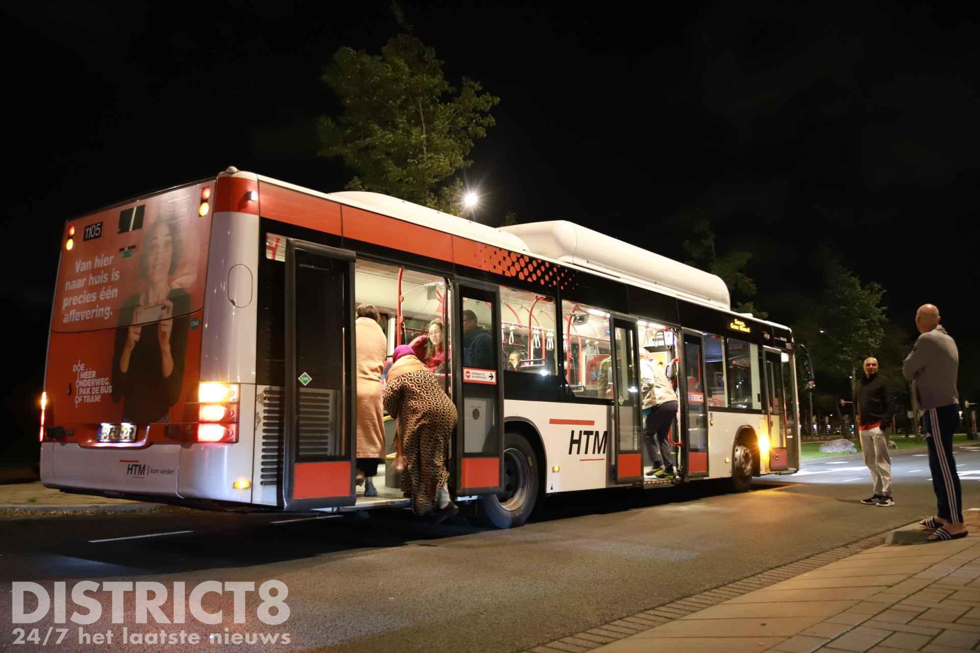 Bewoners die ontruimd zijn, zijn tijdelijk opgevangen in een bus van de HTM.