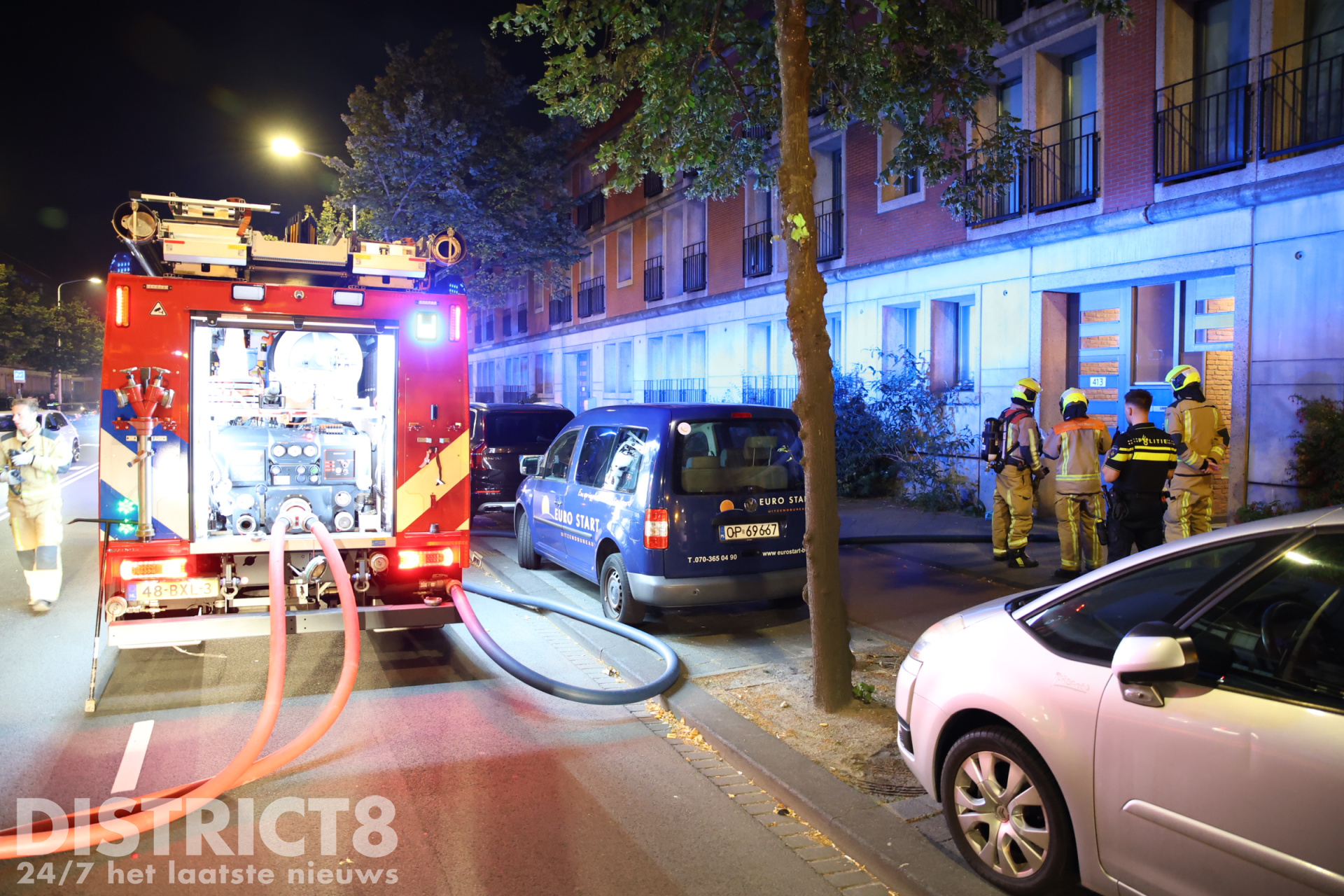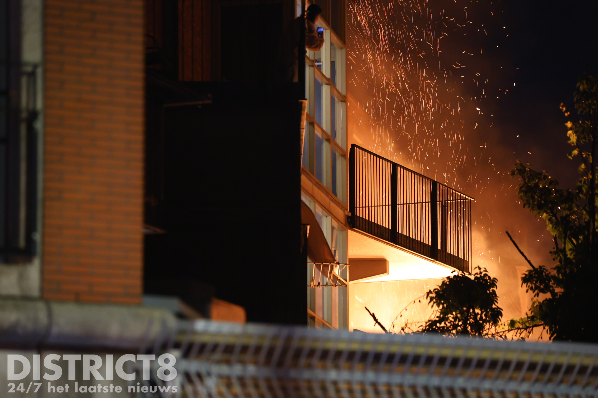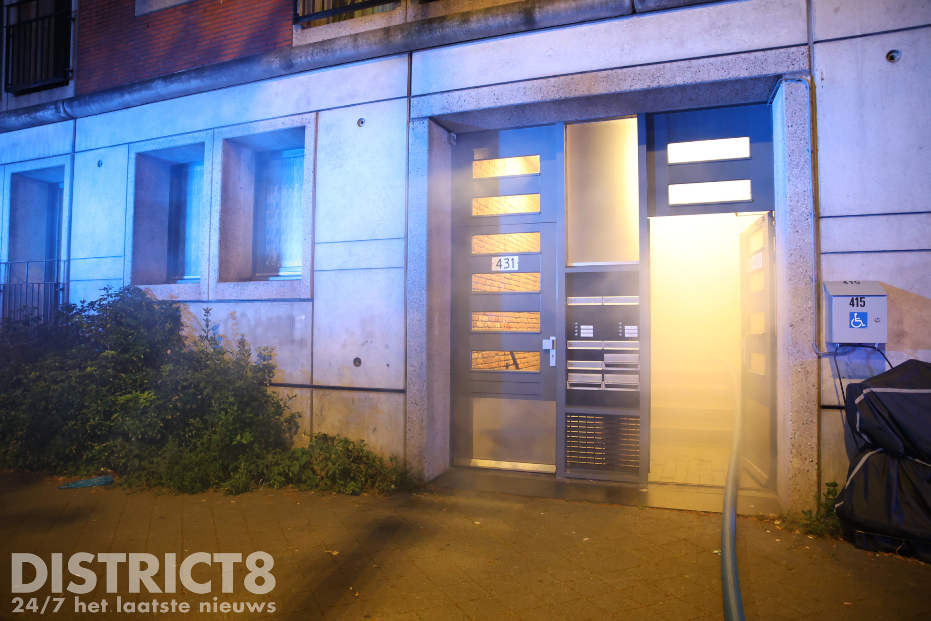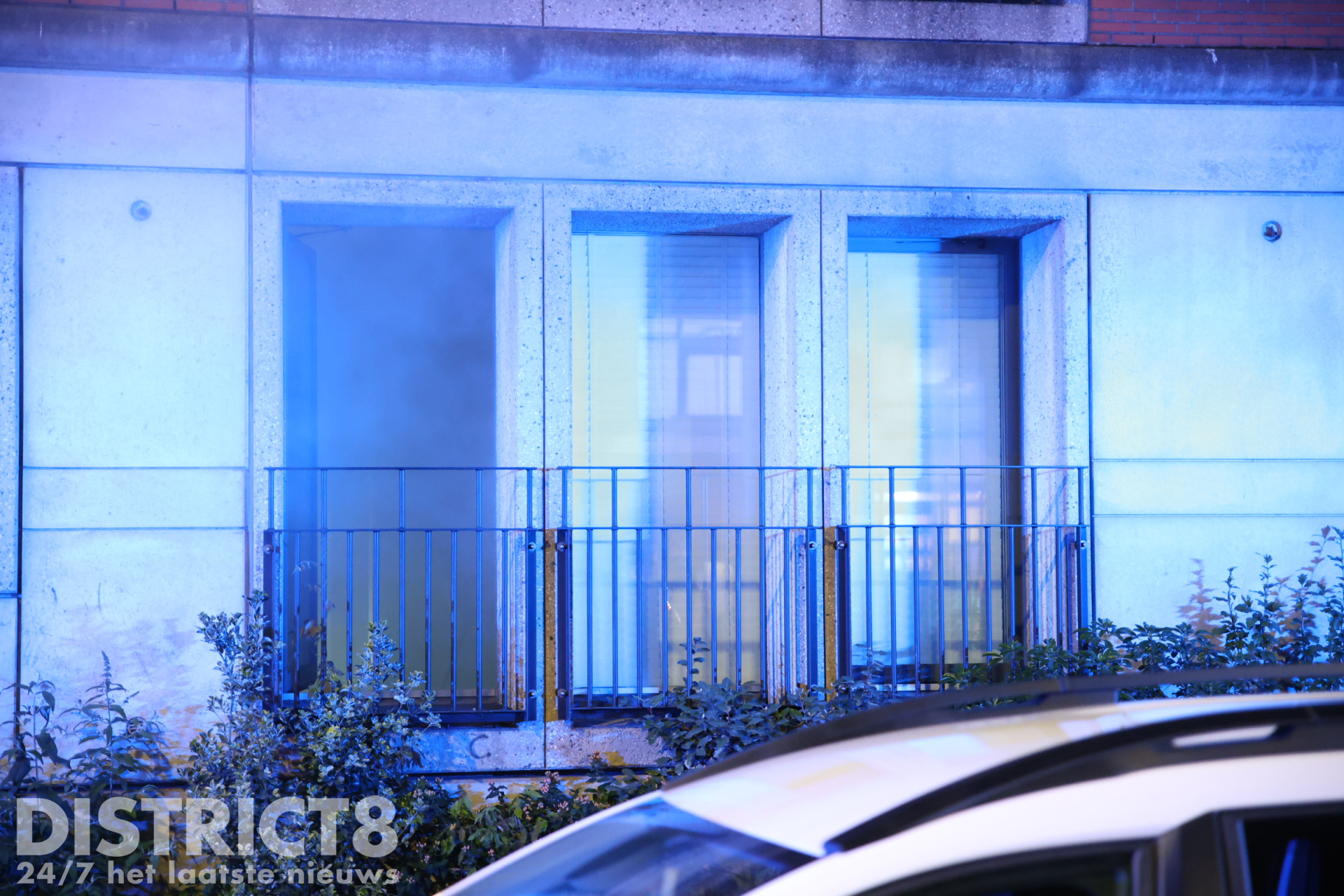 Twee ambulances zijn ter plaatse, vier personen worden nagekeken door de ambulancedienst. Volgens de woordvoerder is de brand van buiten naar binnen geslagen.