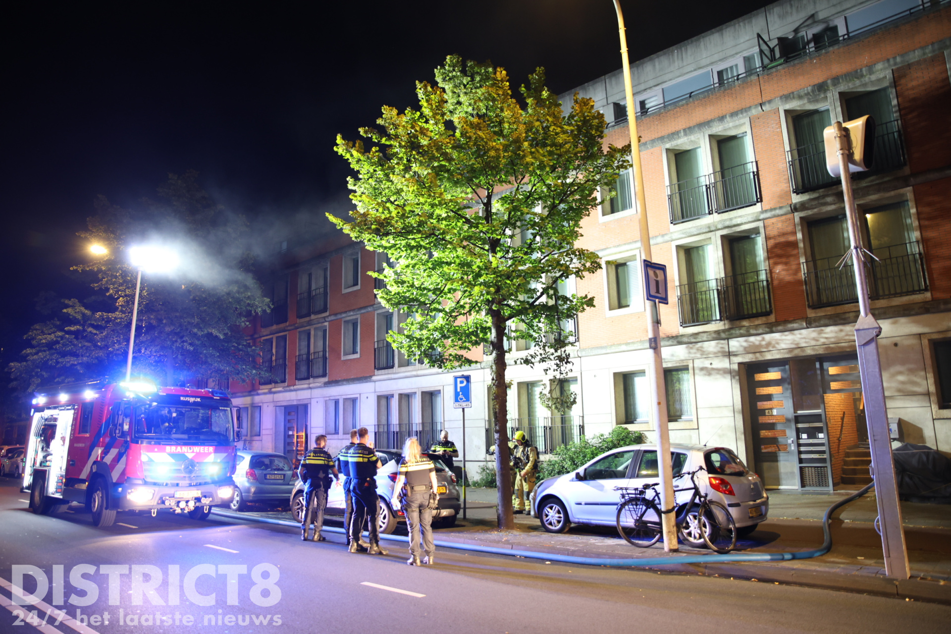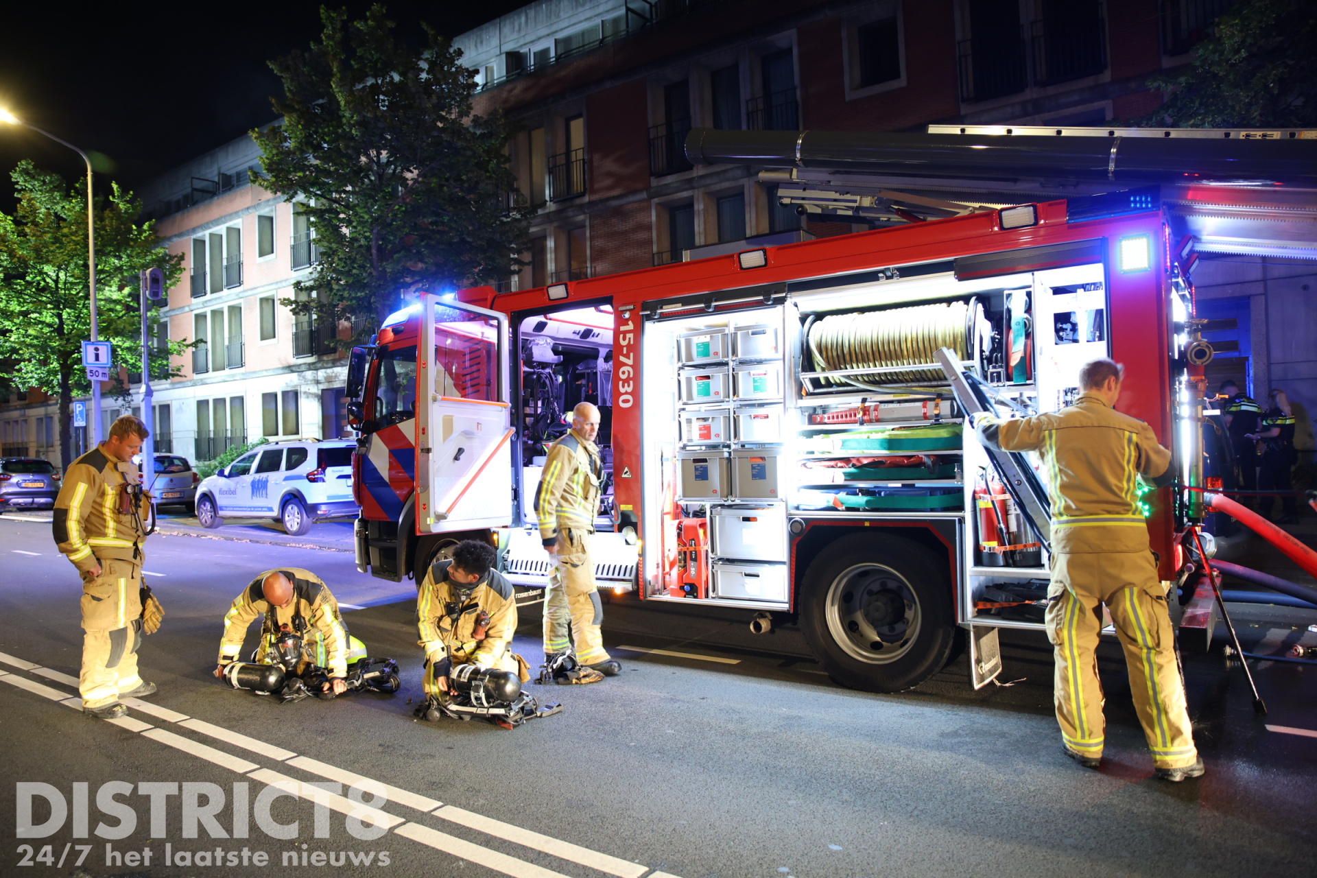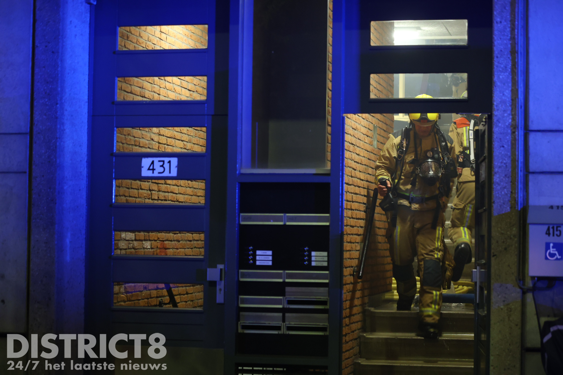 Twee ambulances zijn ter plaatse, vier personen worden nagekeken door de ambulancedienst. Volgens de woordvoerder is de brand van buiten naar binnen geslagen.