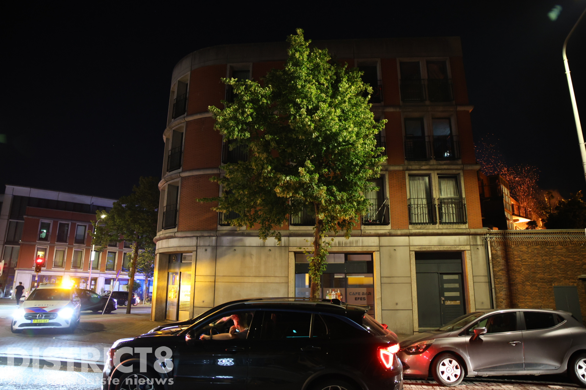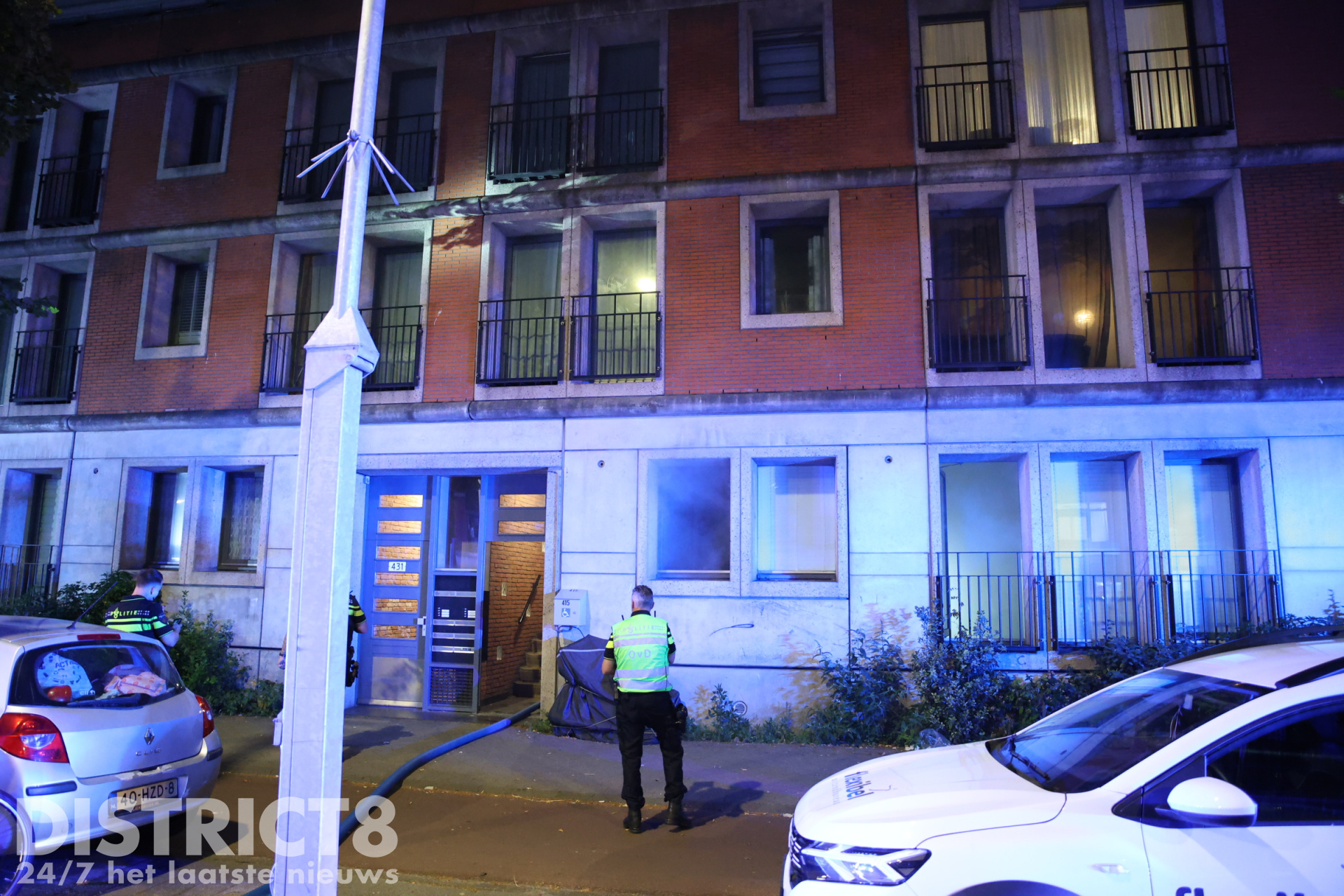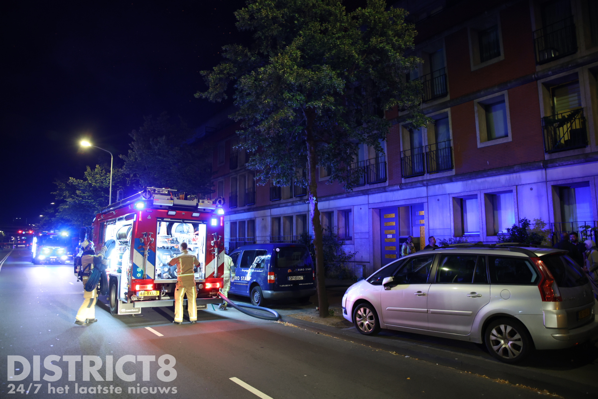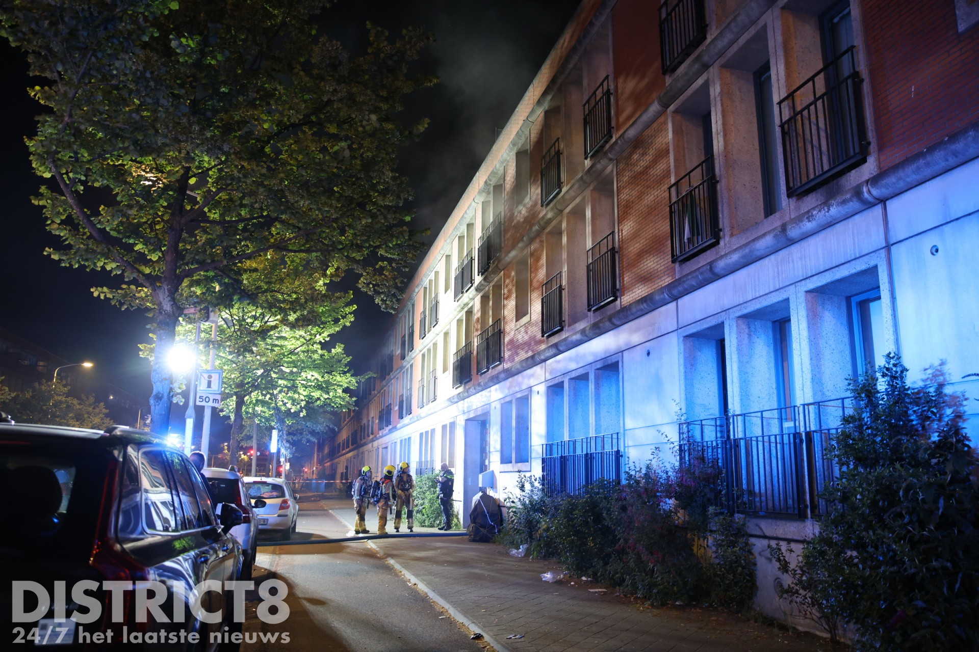 Twee ambulances zijn ter plaatse, vier personen worden nagekeken door de ambulancedienst. Volgens de woordvoerder is de brand van buiten naar binnen geslagen.