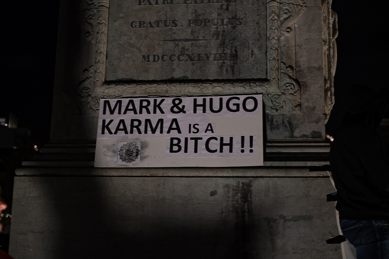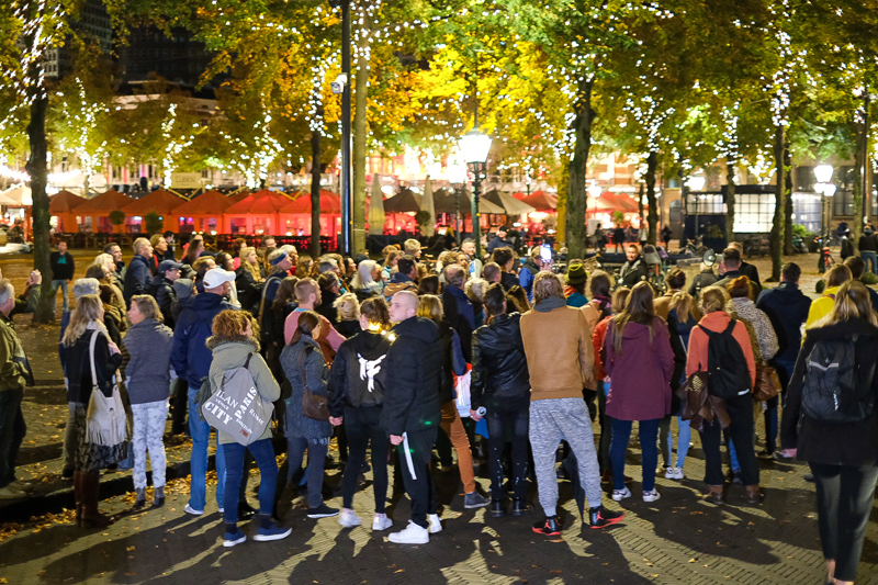 Volgens verschillende omstanders zouden er honderden demonstranten aanwezig zijn bij de demonstratie.Er worden meerdere spandoeken opgehangen aan het standbeeld welke op het Plein staat.