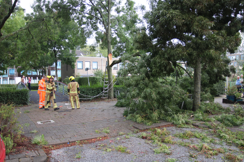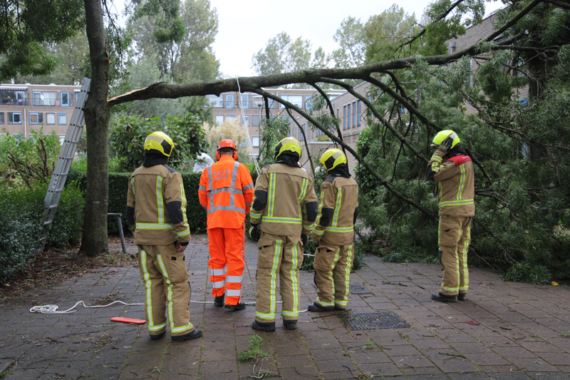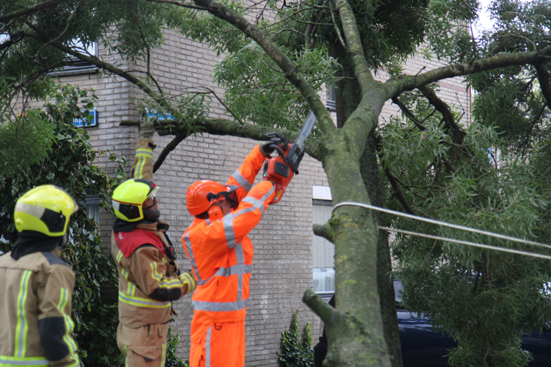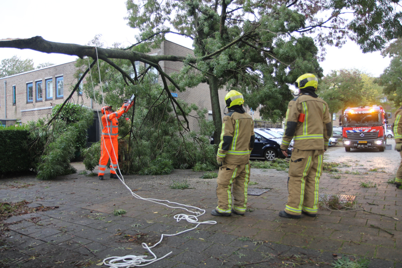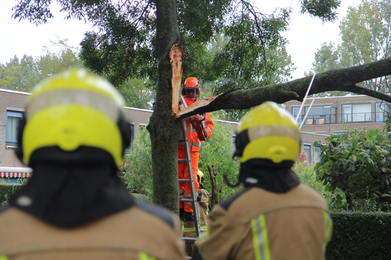 Bij aankomst van de brandweer bleek er een grote tak te zijn afgebroken door de harde wind, de brandweer heeft een plan van aanpak gemaakt om de tak in kleine stukken te zagen.