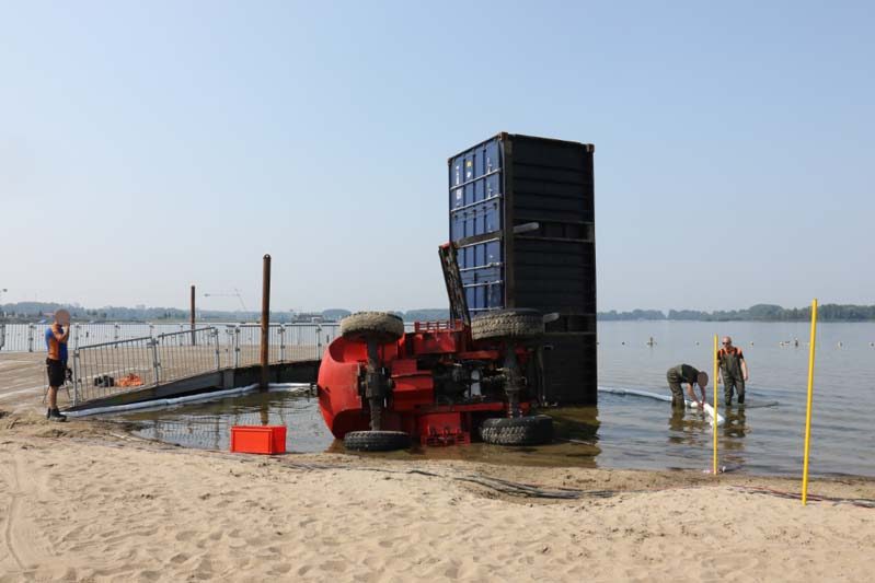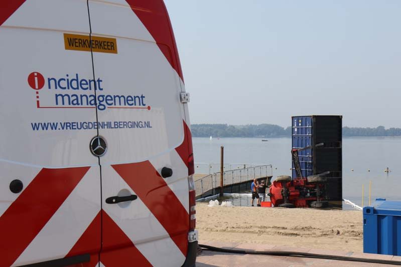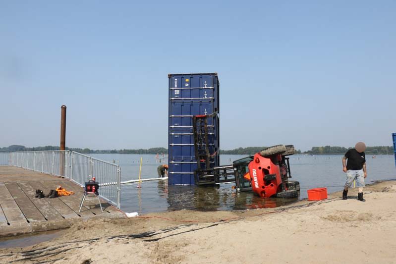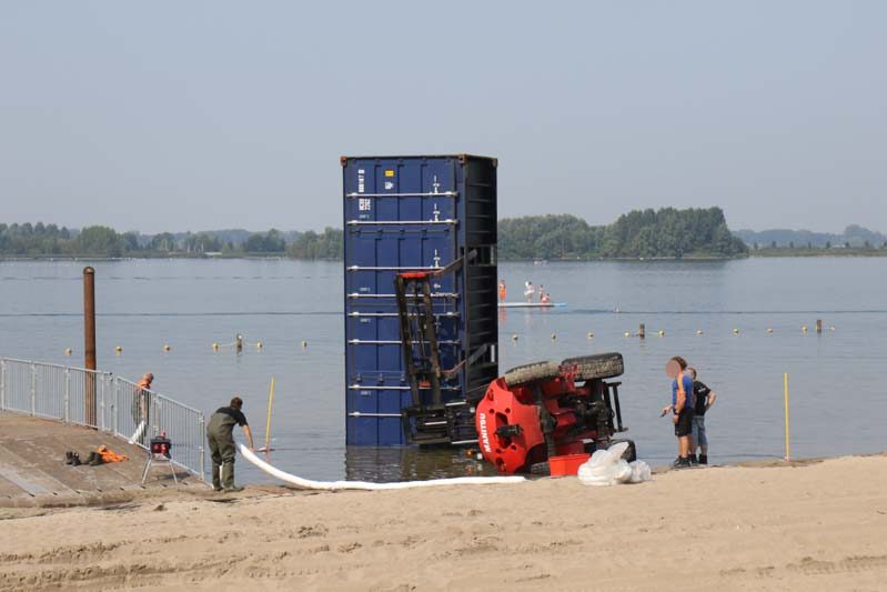 Heftruck met container kantelt in Zevenhuizerplas Rotterdam