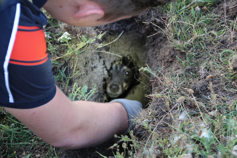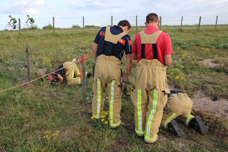 Het hondje is direct vast gemaakt aan de lijn zodat ze niet opnieuw een konijnenhol in zou schieten.