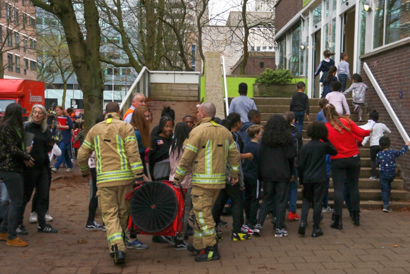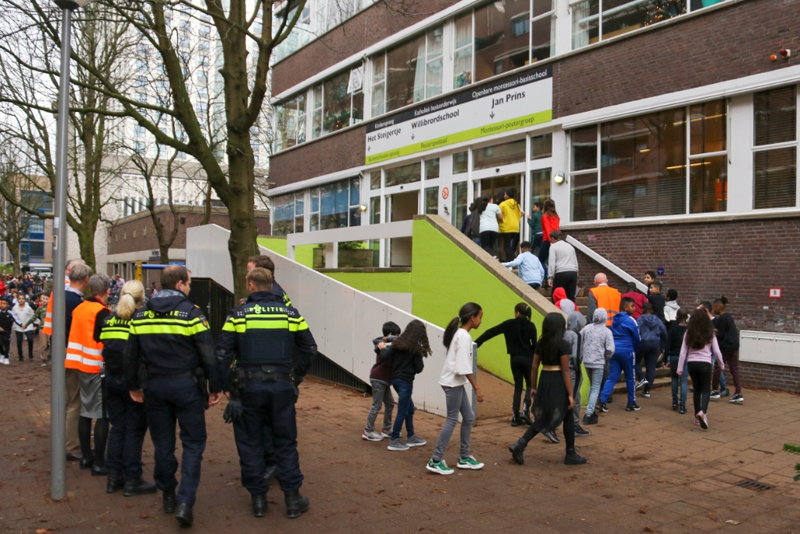 De groepen 1-8 van twee scholen en de buitenschoolse opvang werden snel naar buiten geleid en op veilige afstand opgevangen. De brandweer schaalde direct op naar middelbrand in verband met de ontruiming. Het bleek te gaan om een klein brandje in een prullenbak, deze was snel onder controle maar had wel voor rook in het pand gezorgd.