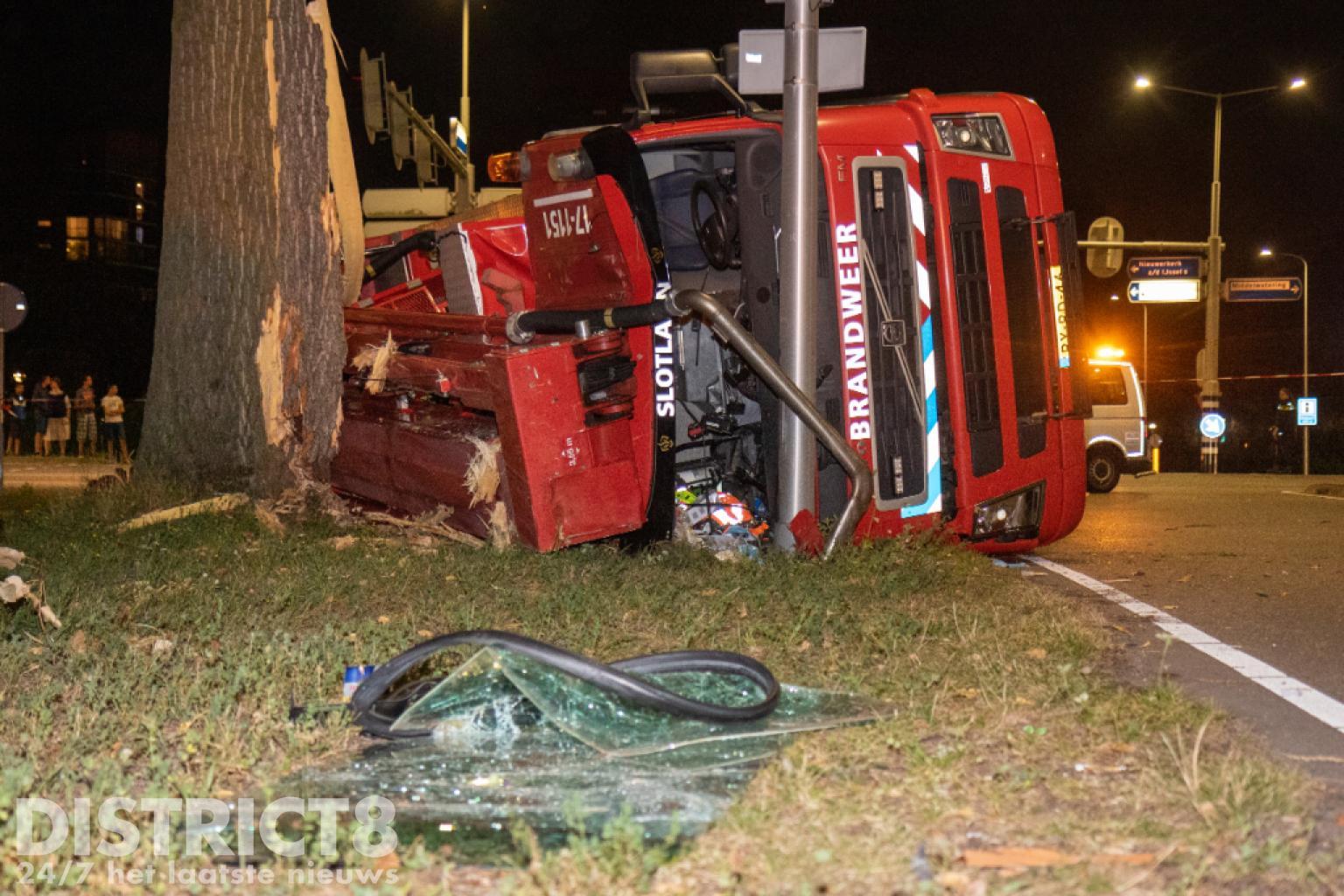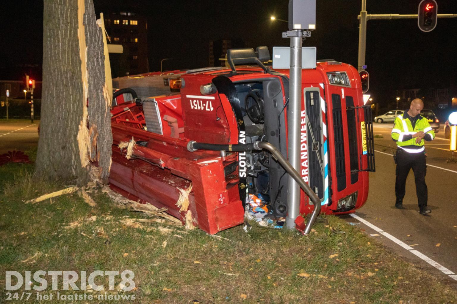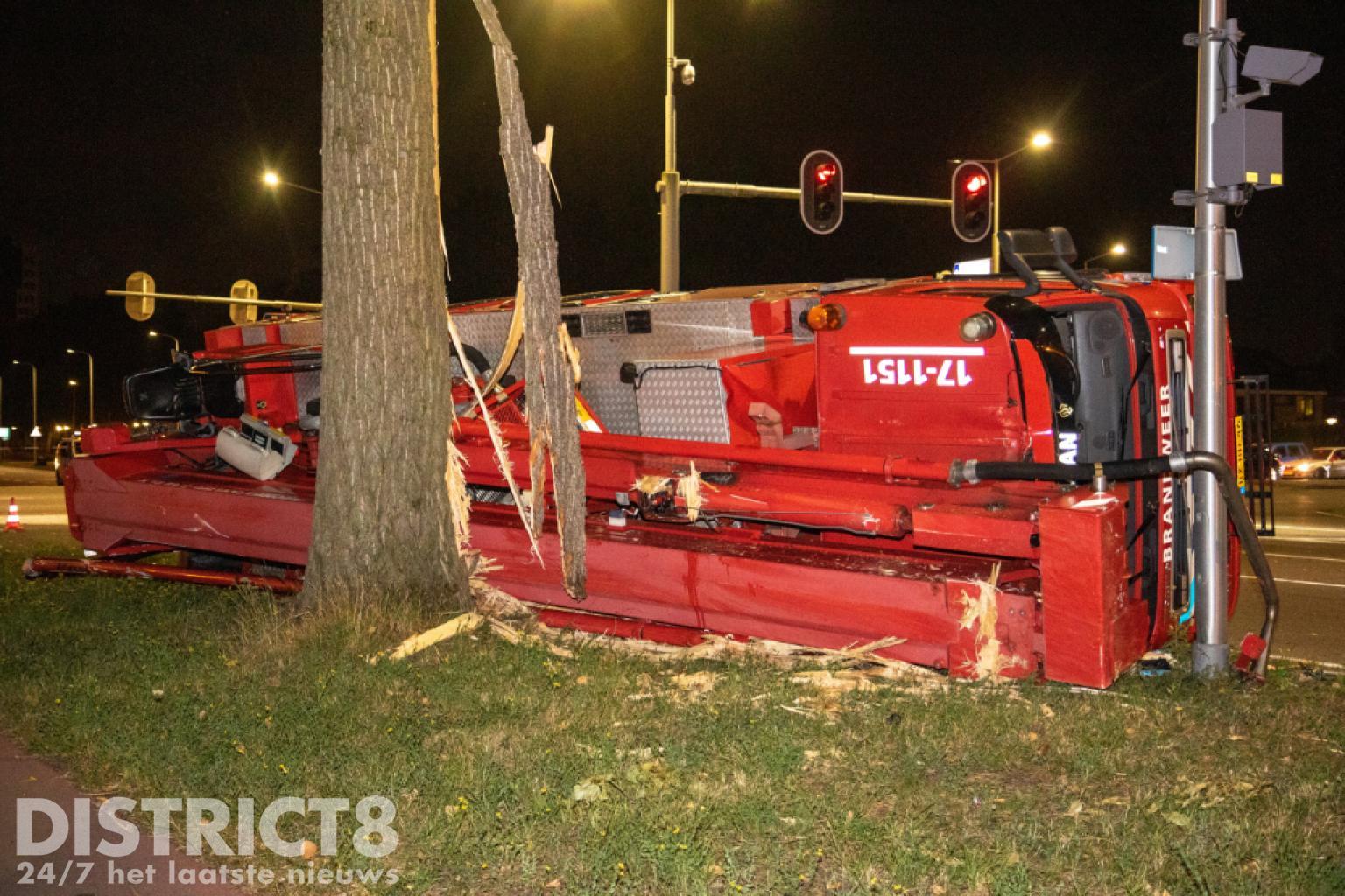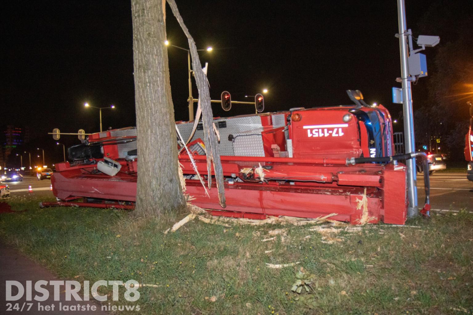 De hoogwerker was met spoed onderweg naar een melding van een woningbrand toen het misging op het kruispunt. De twee brandweermannen uit de wagen raakten bij het ongeval gewond.