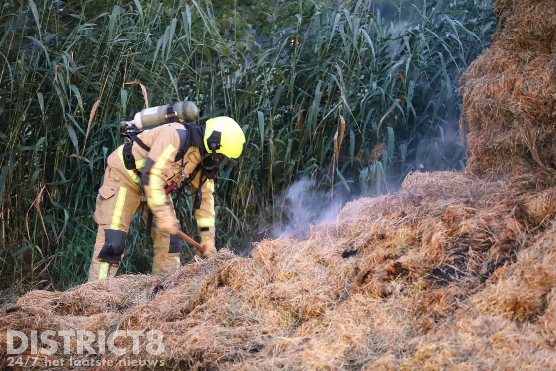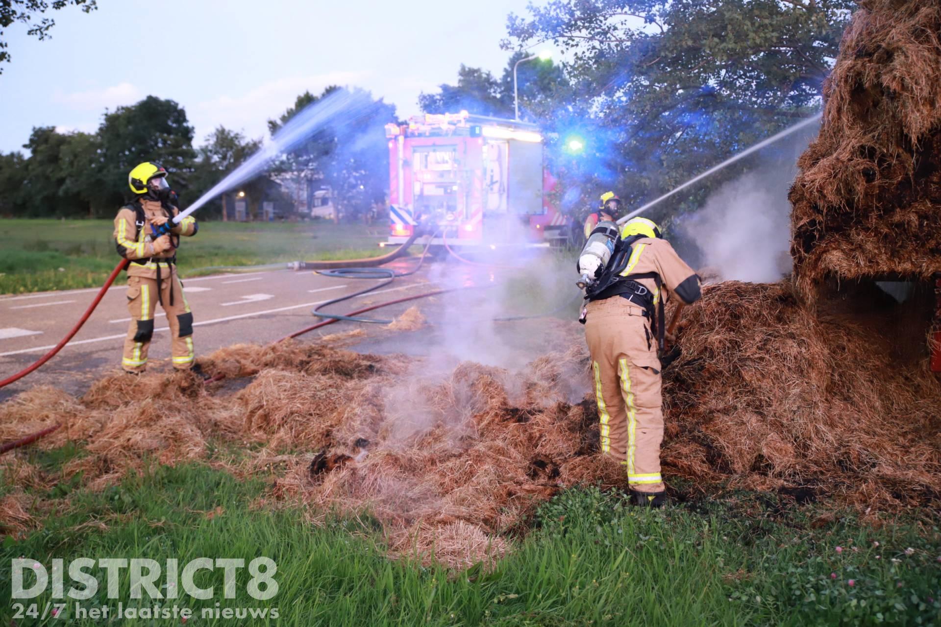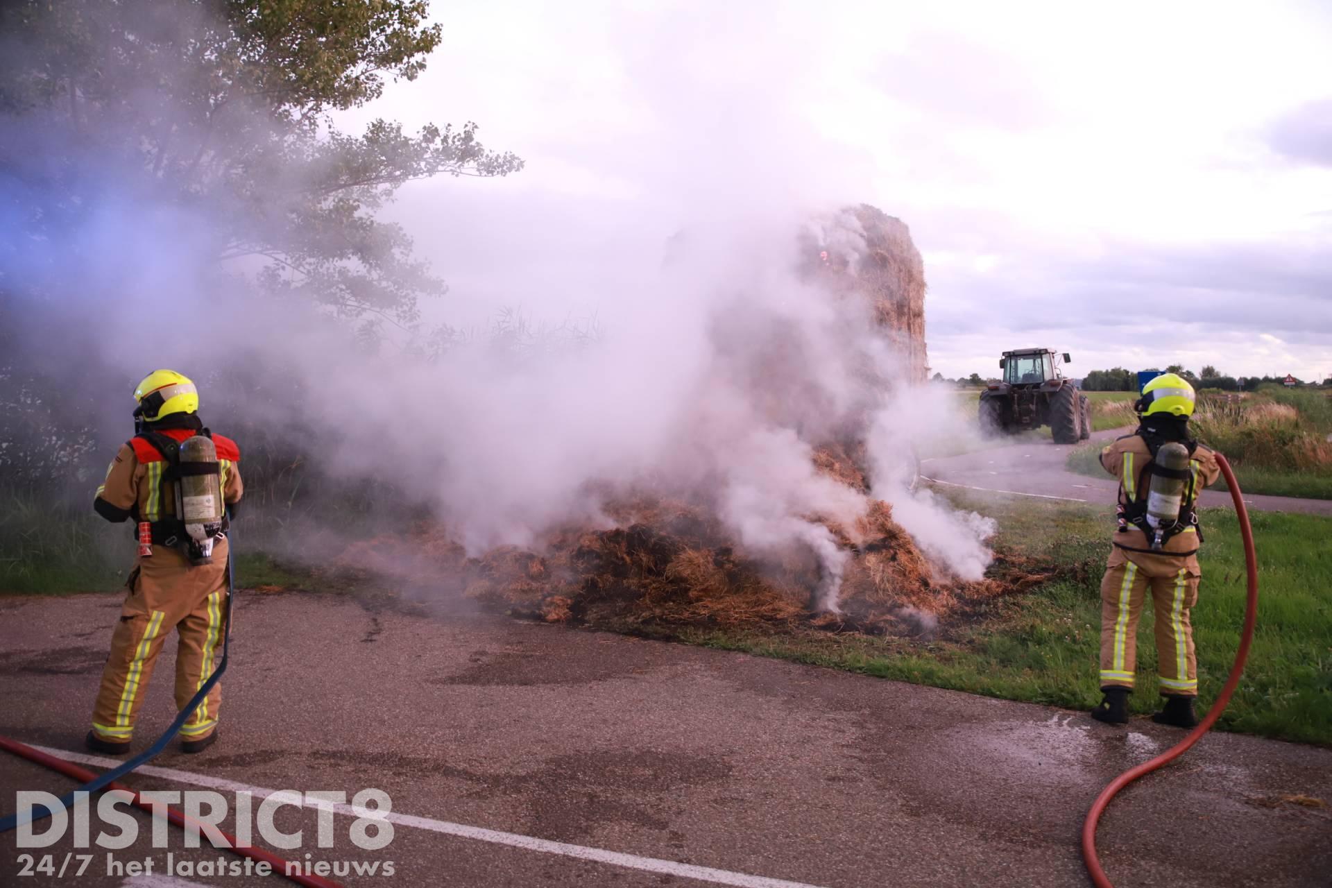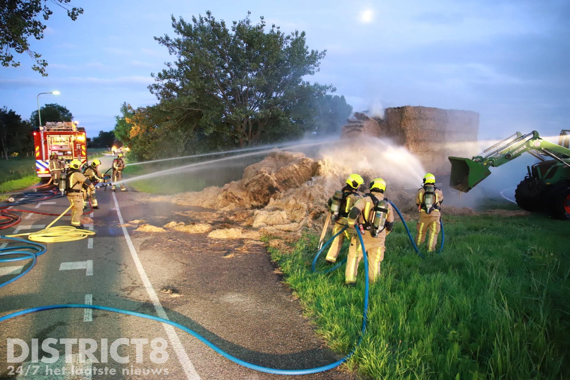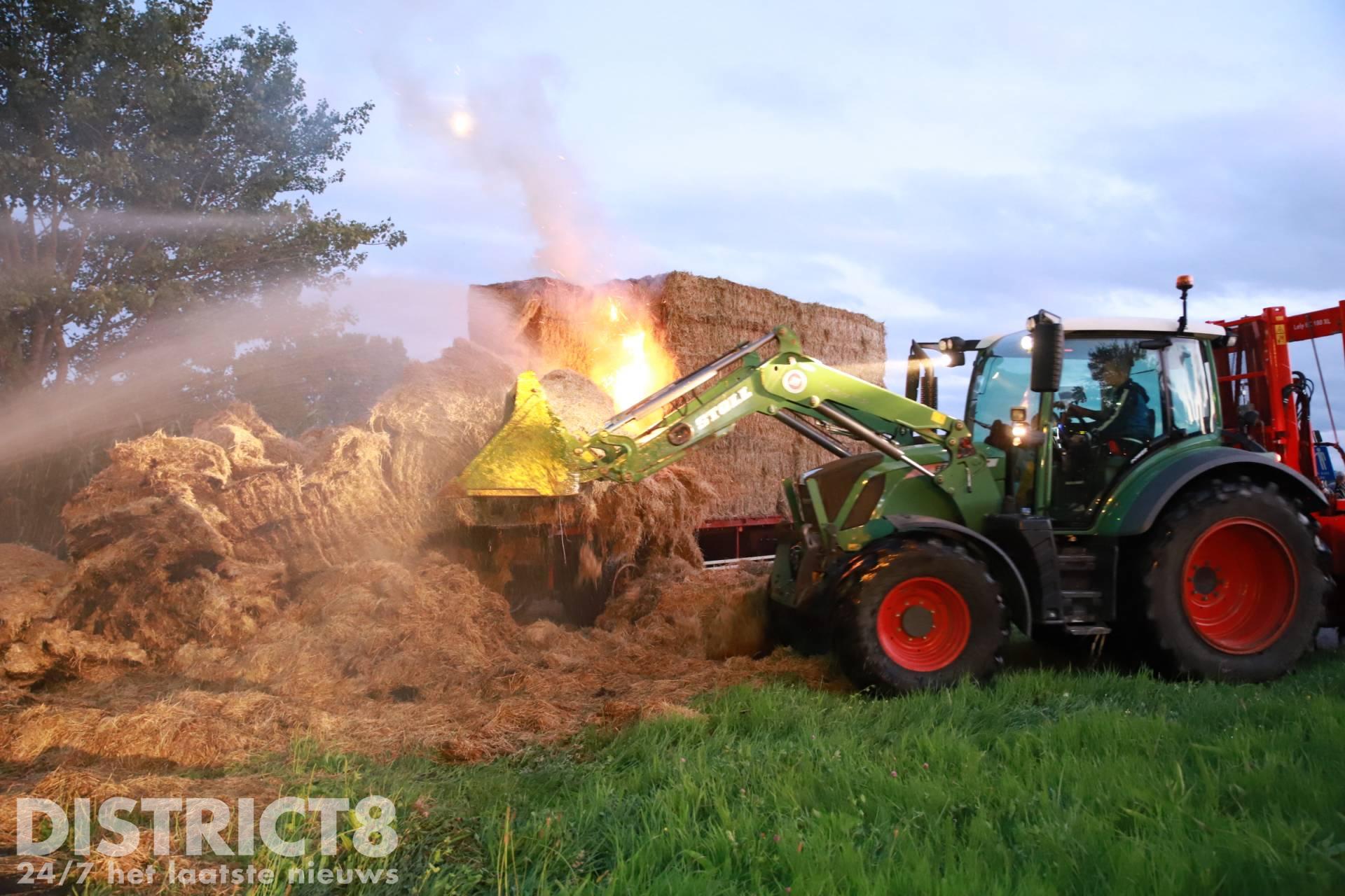 De boer heeft de brandweer geholpen door delen van de hooibalen uit elkaar te halen met zijn trekker. De brand is inmiddels volledig geblust.