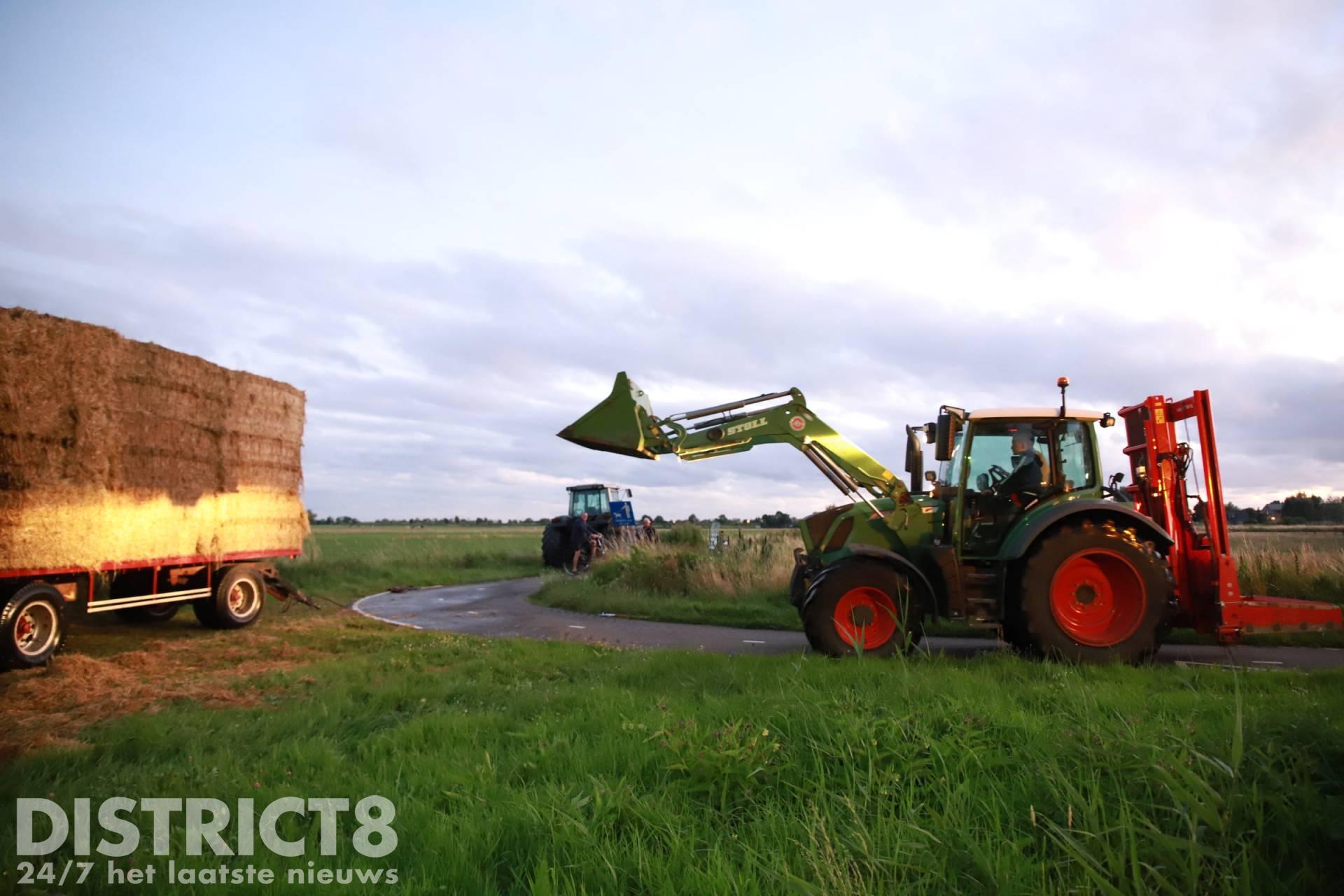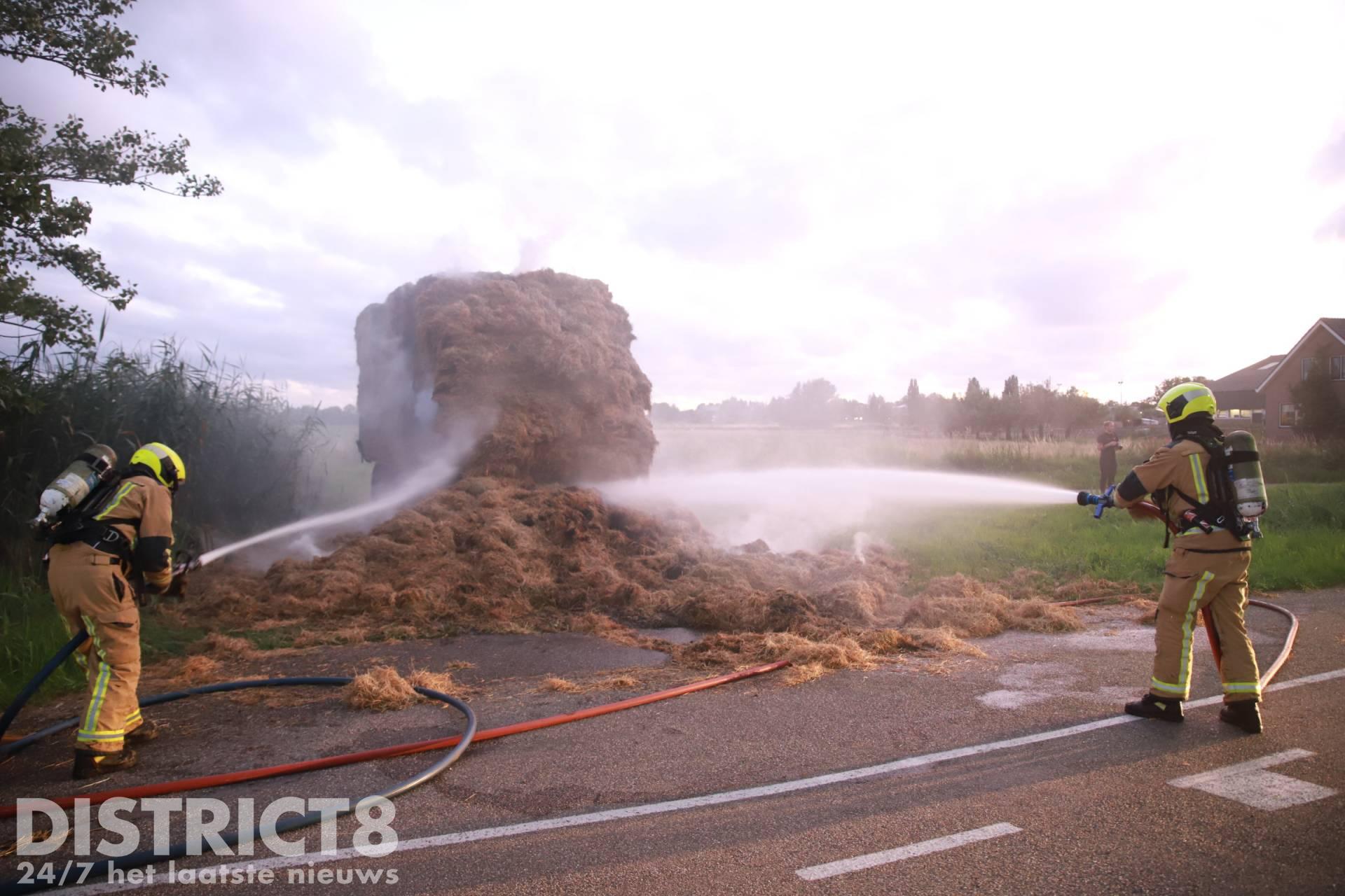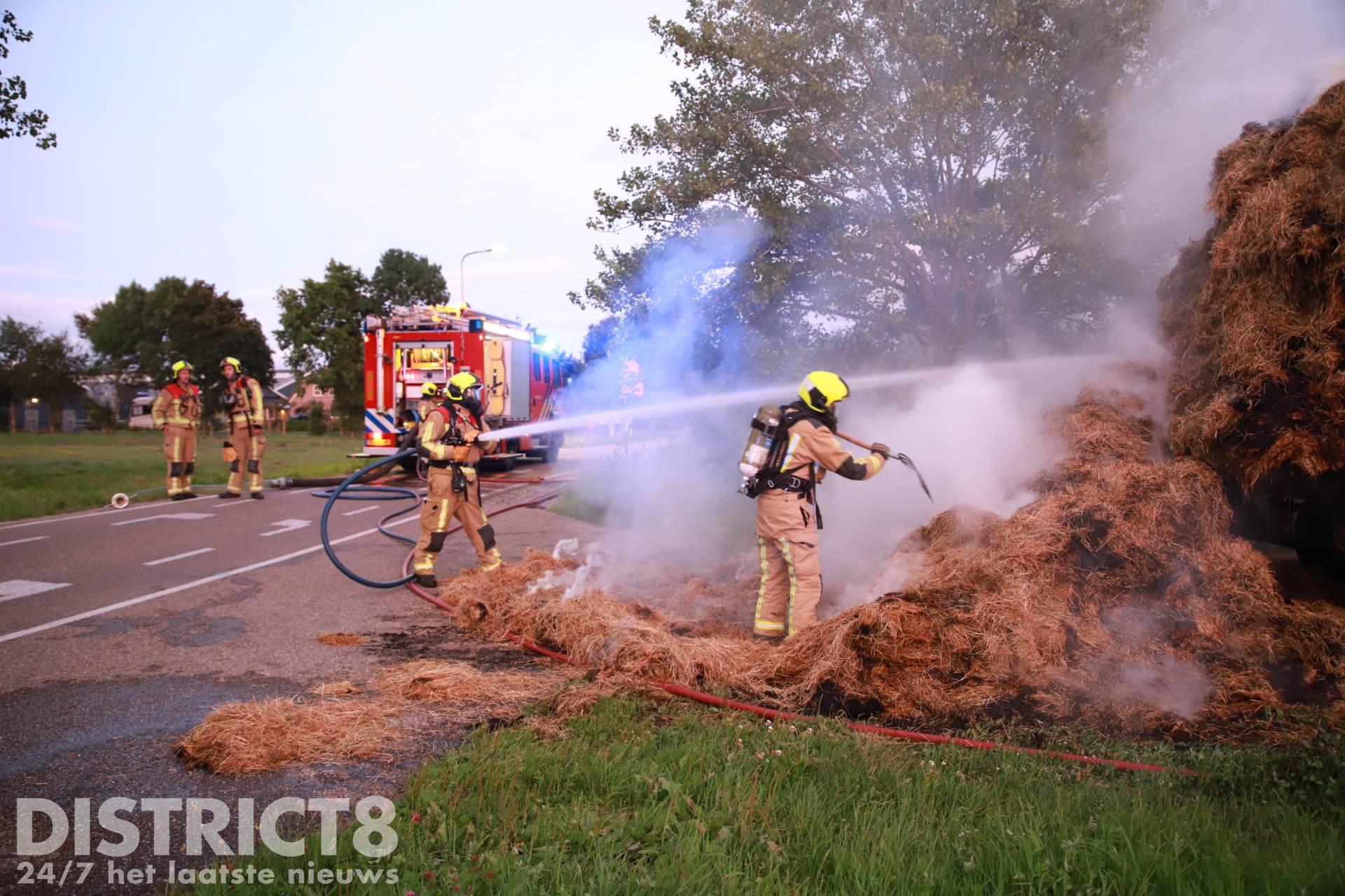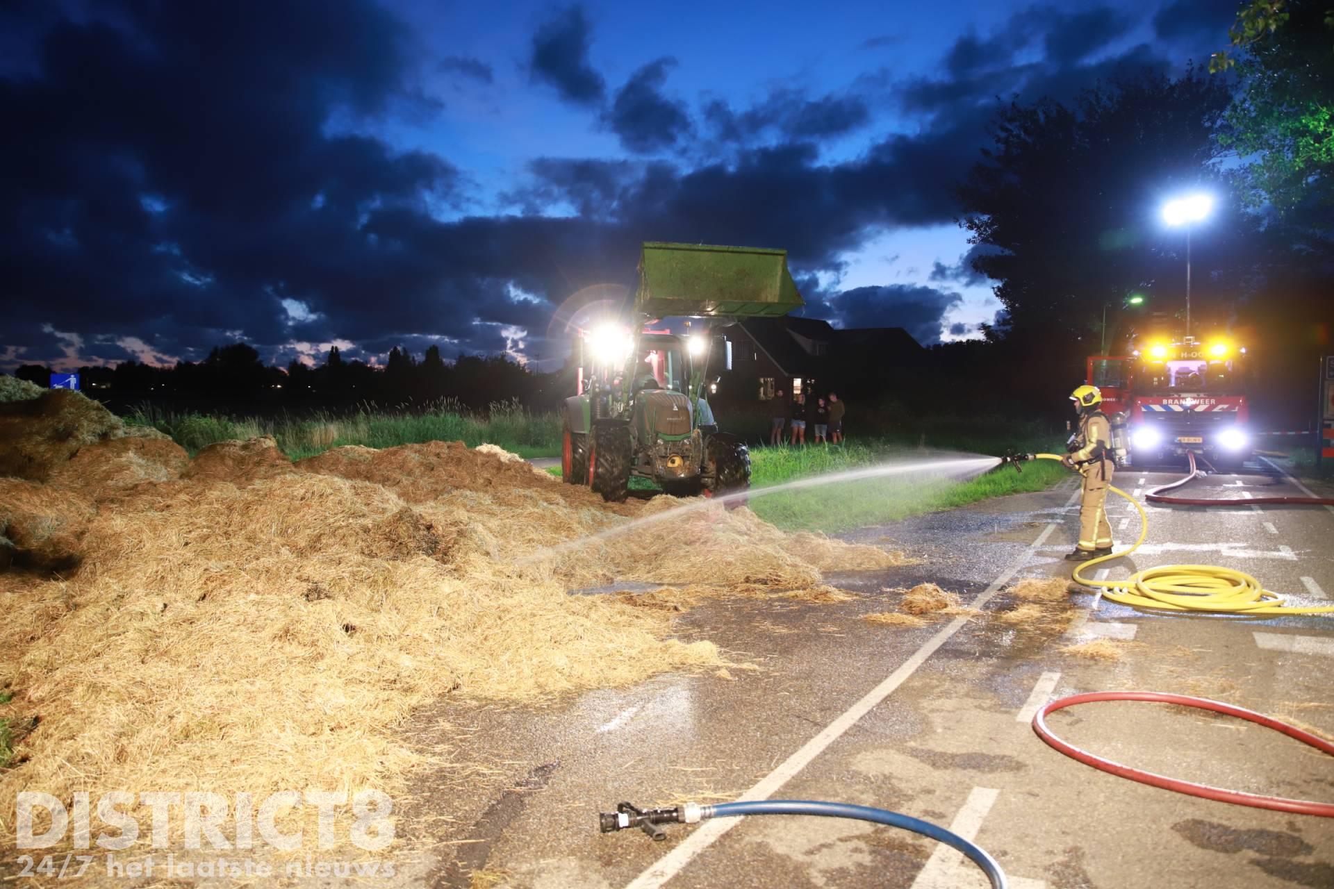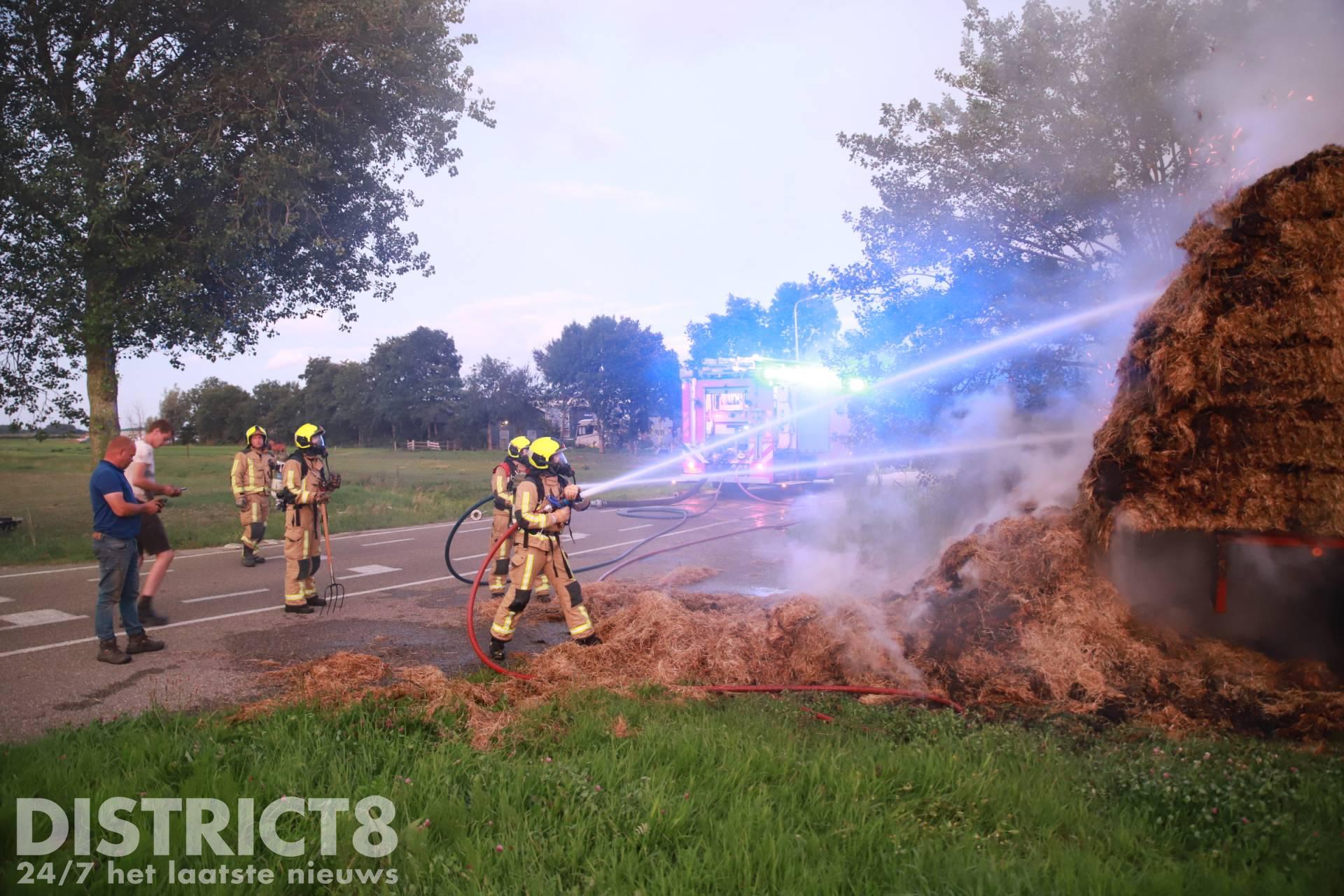 De boer heeft de brandweer geholpen door delen van de hooibalen uit elkaar te halen met zijn trekker. De brand is inmiddels volledig geblust.