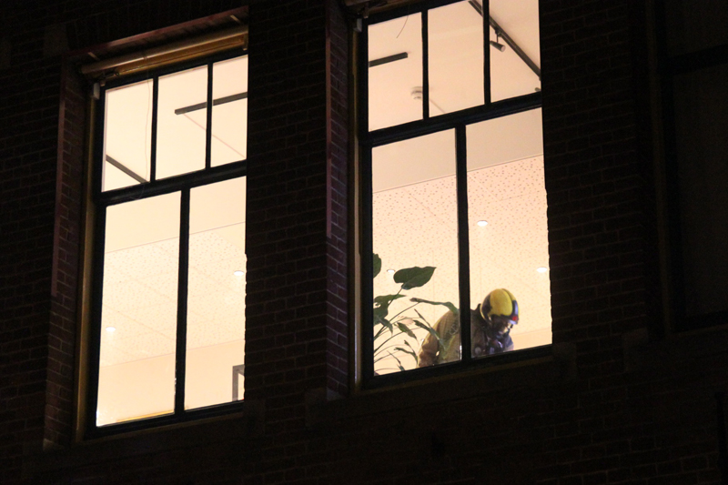 Zowel binnen als aan de buitenkant van het hotel werd gezocht naar een oorzaak. Buiten werd een hoogwerker opgesteld om via deze zijde een onderzoek te starten.