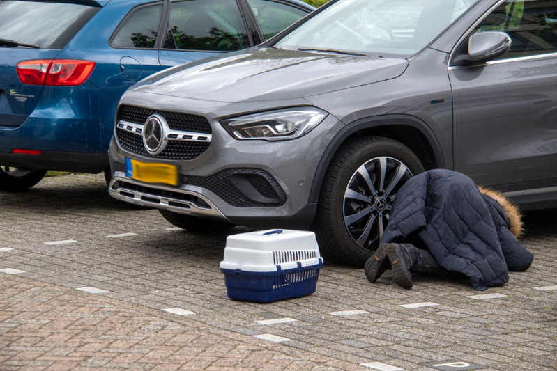 De kat zat een stuk verderop onder een auto, maar deze keer kon de redding wel plaatsvinden.