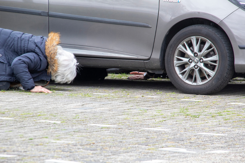 Een kat zat onder een motorcompartiment van een auto. De eigenaresse van de kat was onderweg naar de dierenkliniek (een paar meter verderop) toen de kat ontsnapte en onder de auto ging zitten.