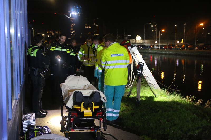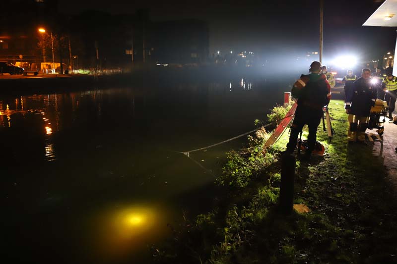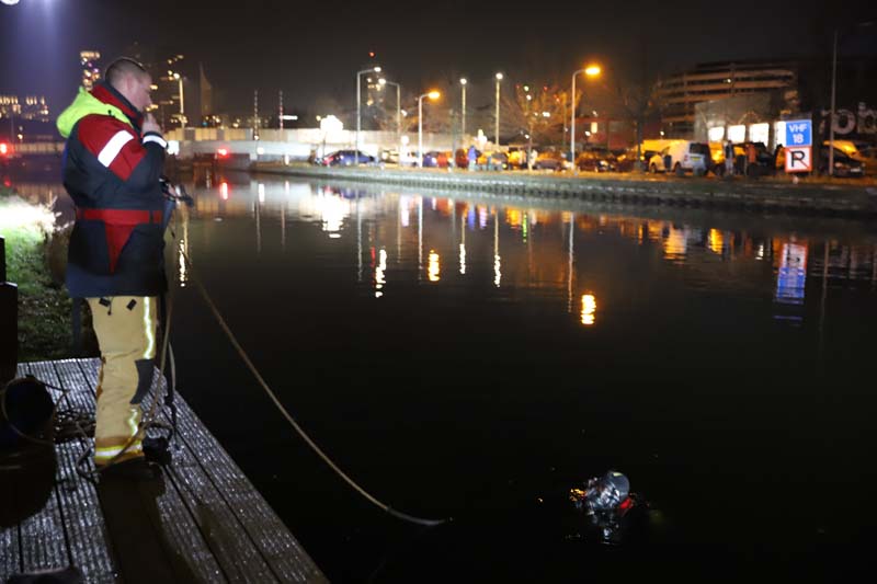 De brandweer is met twee brandweerduikers te water en is op zoek naar een mogelijk slachtoffer die zich in het water bevindt. Ambulancepersoneel staat klaar voor de opvang van het eventuele slachtoffer.