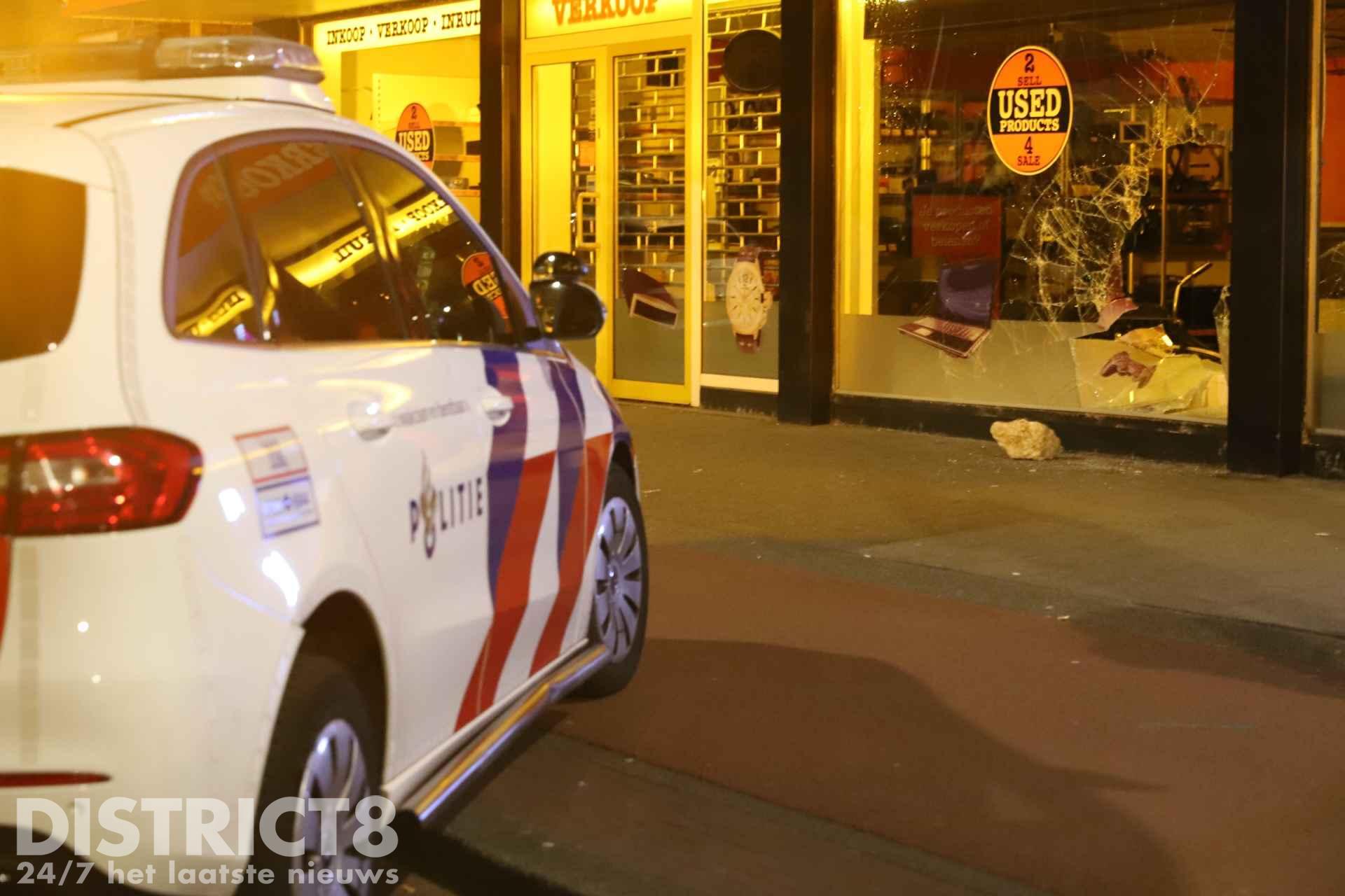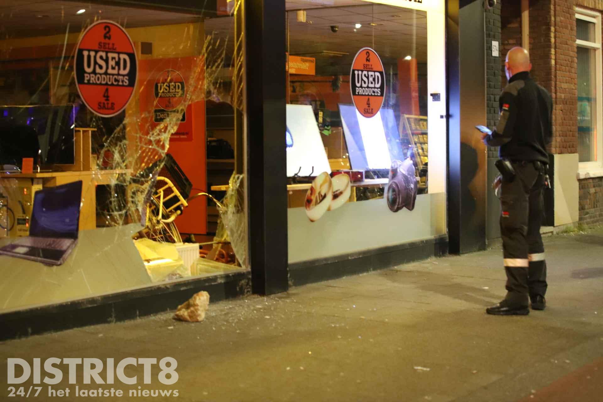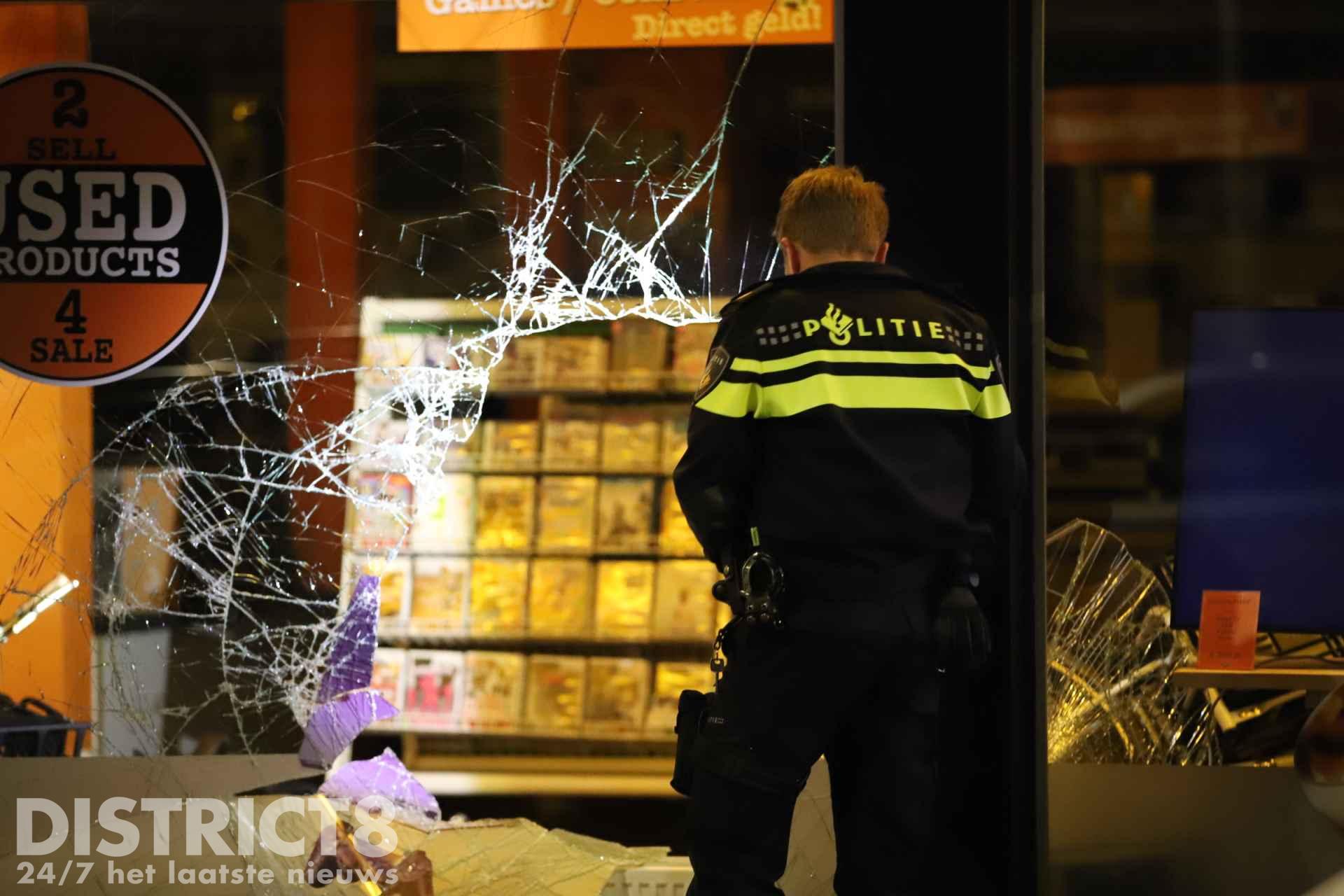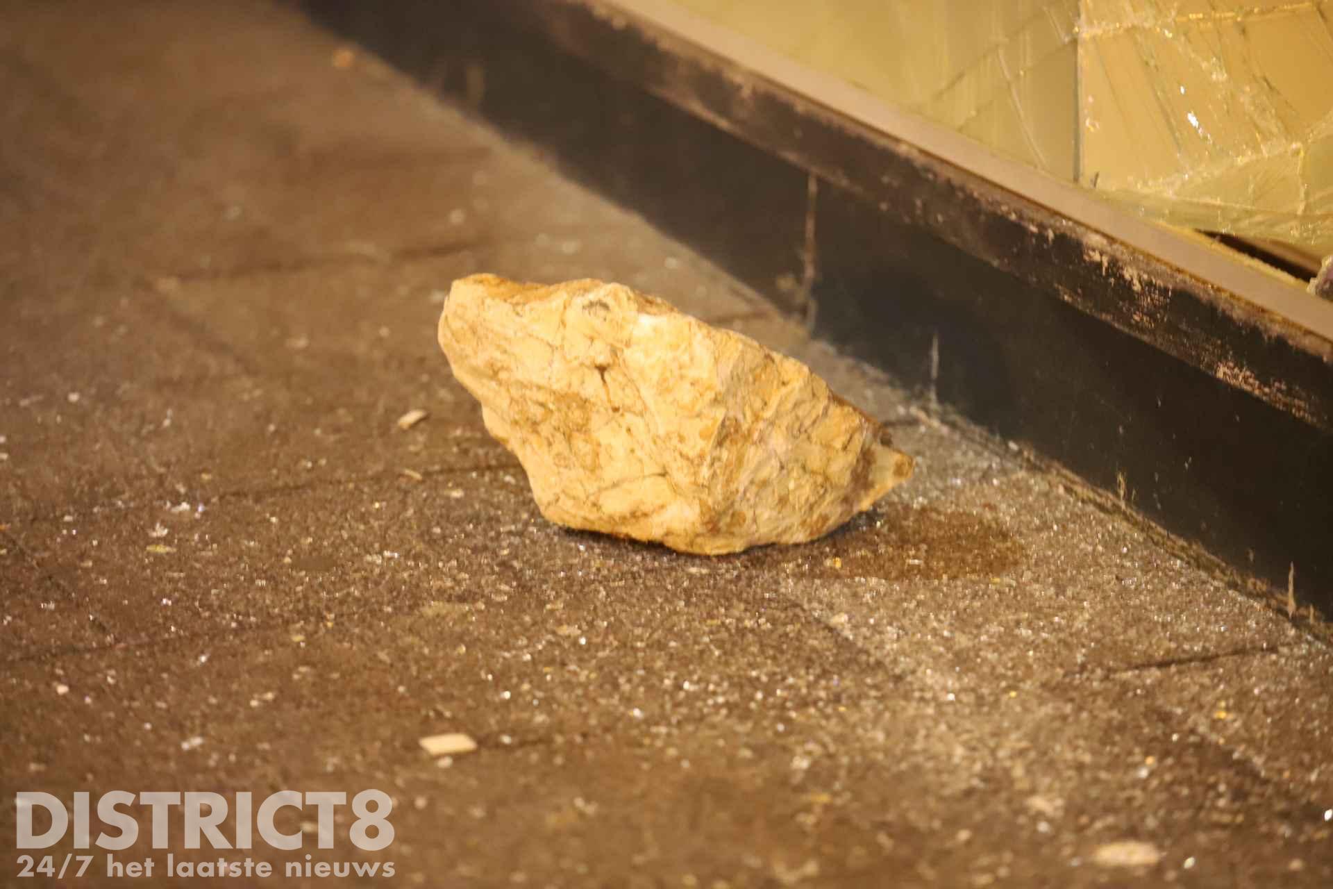 Het raam van het pandjeshuis was ingegooid met een grote steen. In het raam was een groot gat zichtbaar. Achterin de winkel was een vitrine leeggehaald.