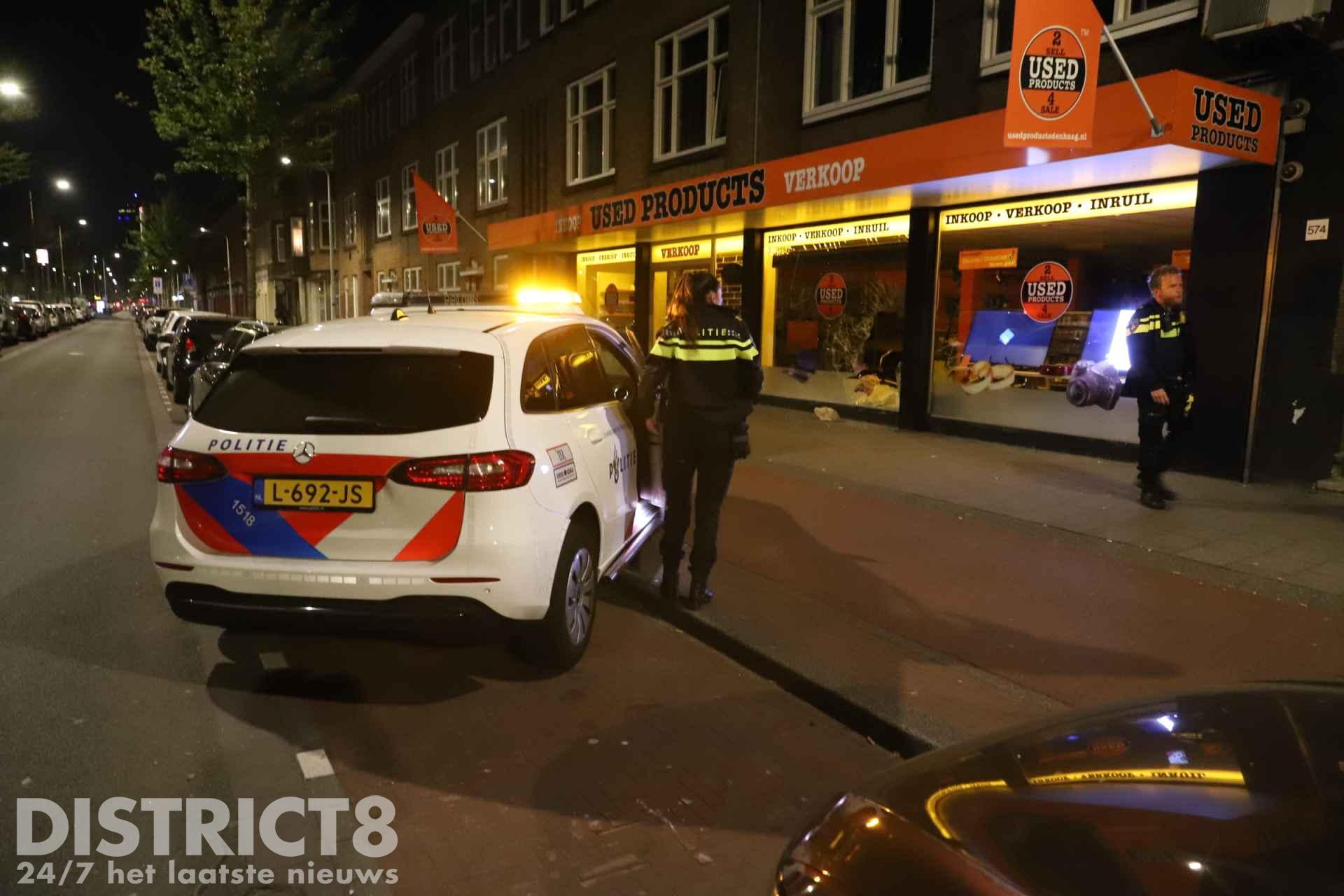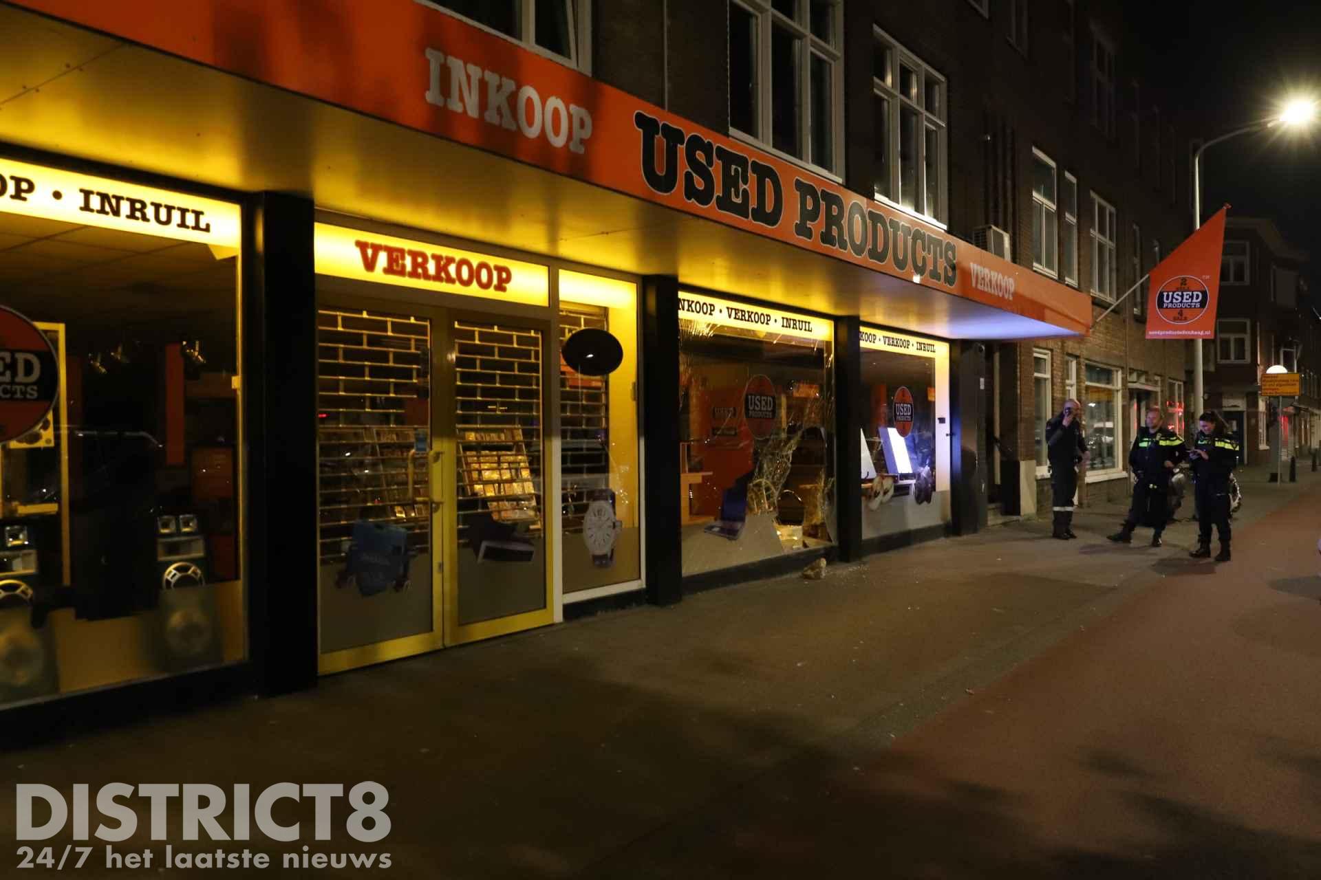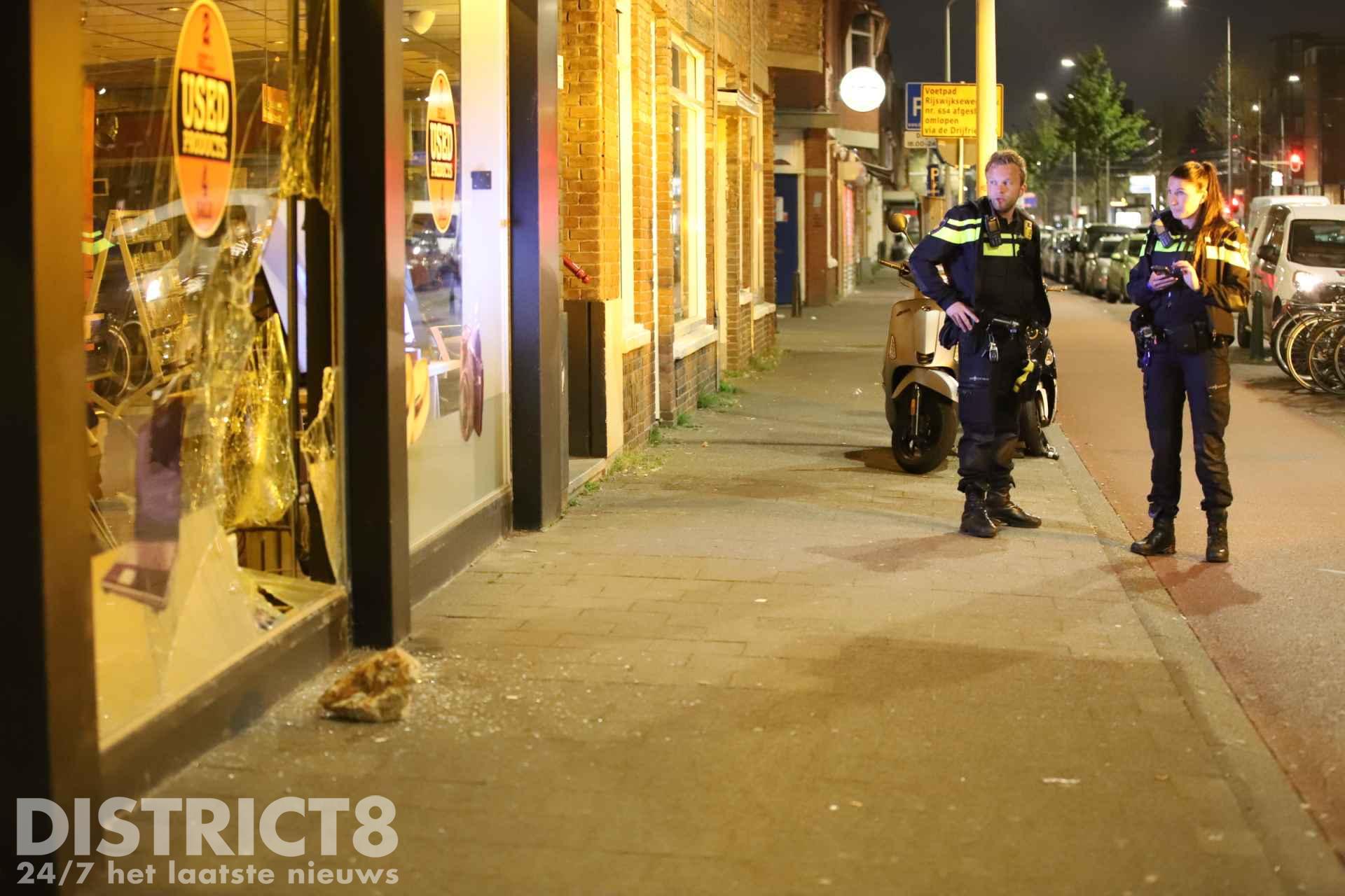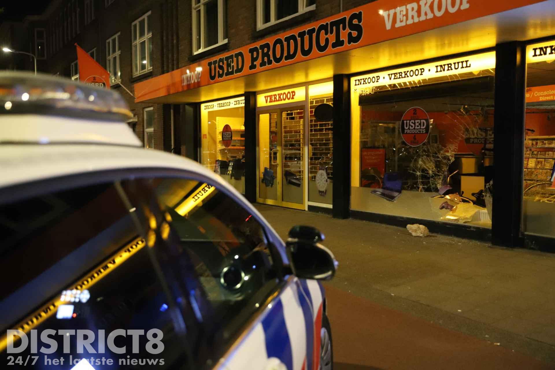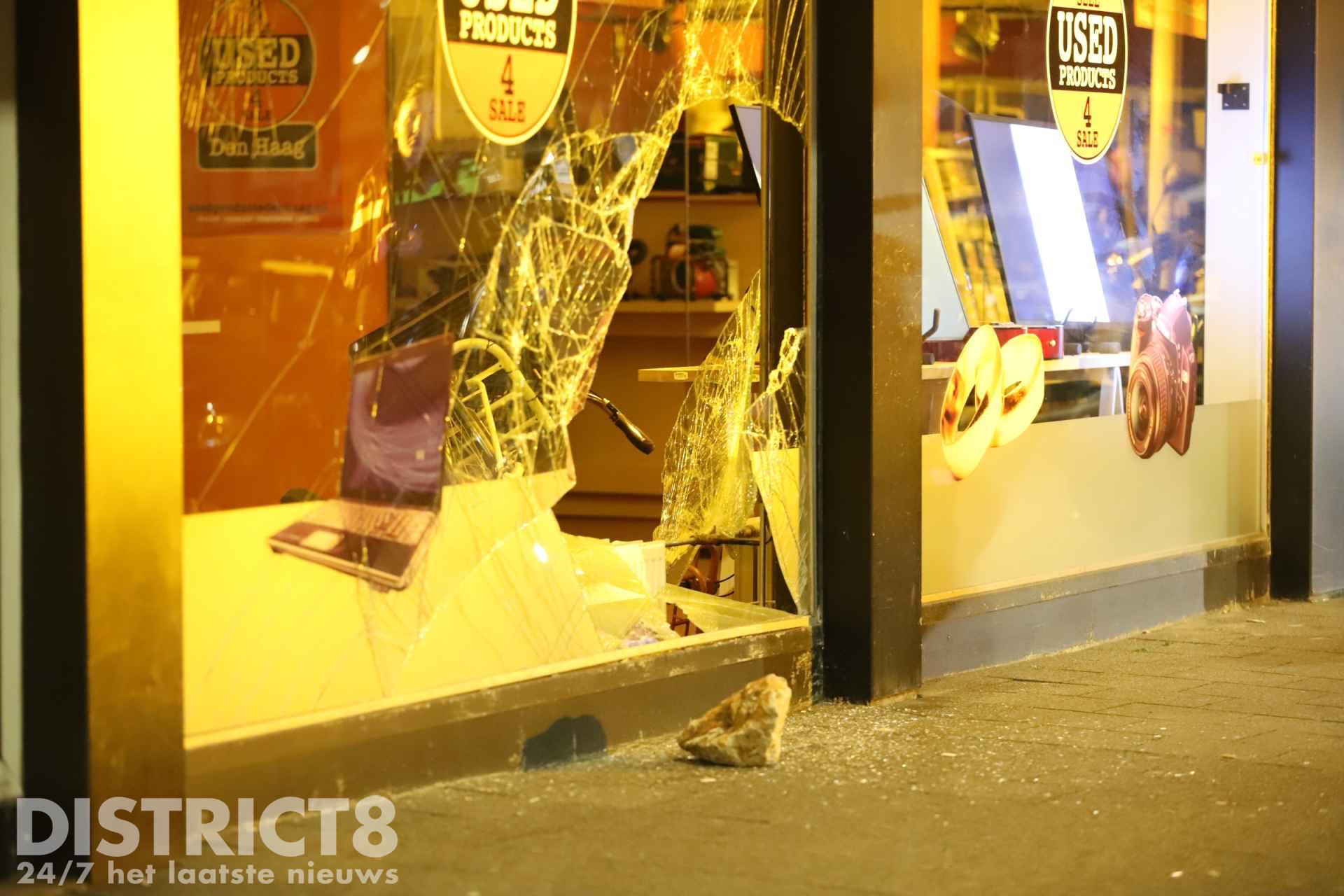 Het raam van het pandjeshuis was ingegooid met een grote steen. In het raam was een groot gat zichtbaar. Achterin de winkel was een vitrine leeggehaald.