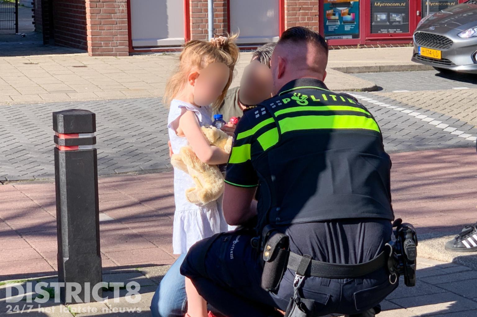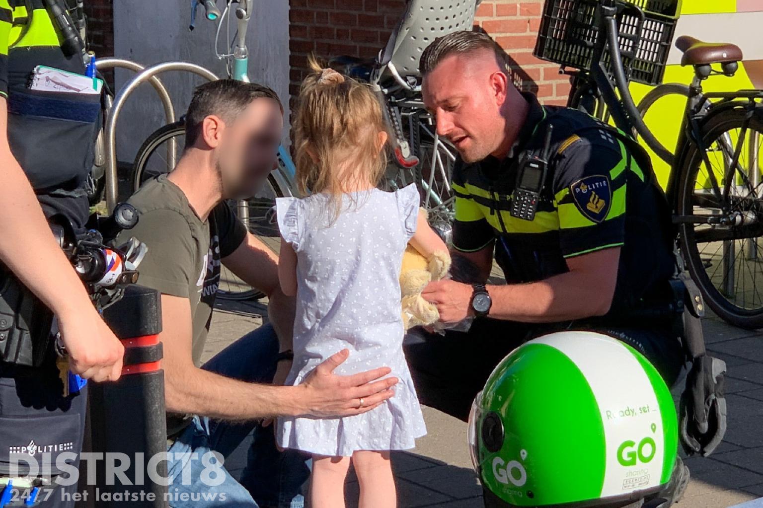 Het kleine meisje -dat achter op de fiets bij vader zat- kreeg voor de schrik een troostbeertje van de politie. Onderzoek moet uitwijzen of de scooterrijder in het bezit was van een geldig certificaat.