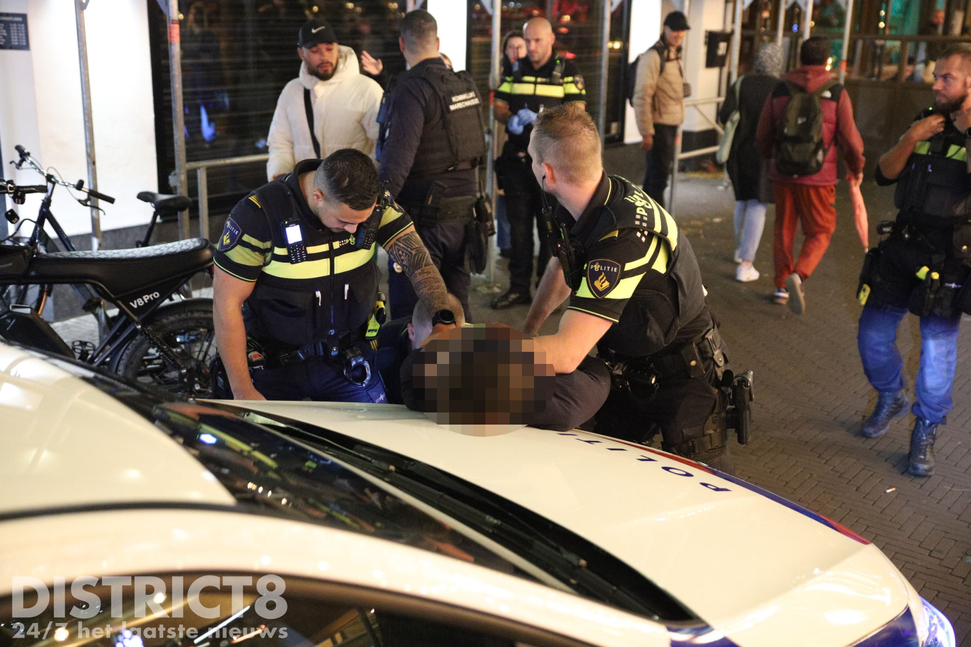 Ter plaatse heeft de politie één persoon aangehouden. De verdachte is gefouilleerd, in een politieauto geplaatst en overgebracht naar het politiebureau.