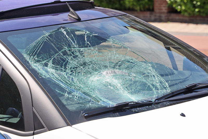 In de voorruit van de auto is een enorme krater te zien door de impact.