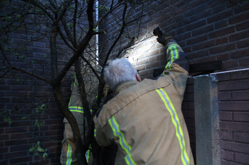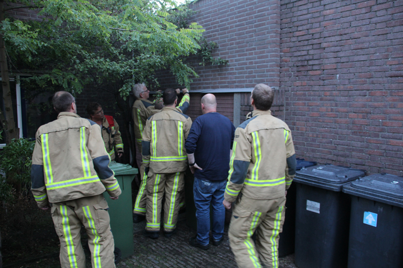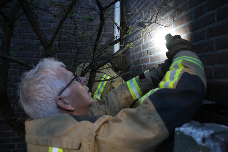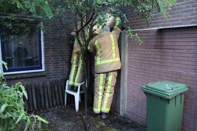 Ter plaatse bleek een 6-karige kat genaamd ‘Baloe’ waarschijnlijk al sinds gister vast te zitten tussen twee hoge muren. Waarschijnlijk is de kat naar beneden gevallen. Omdat het voor de brandweer te smal was om tussen te komen, hebben zij met wat stralen water het dier naar het uiteinde van de steeg geleid.