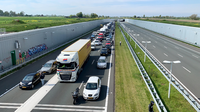 Eén automobilist besloot de file te omzeilen eh heeft op de A20 een stuk tegen het verkeer ingereden. Voor zover bekend is er niemand gewond geraakt.