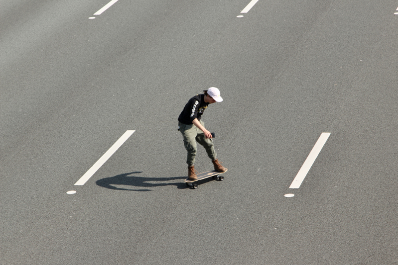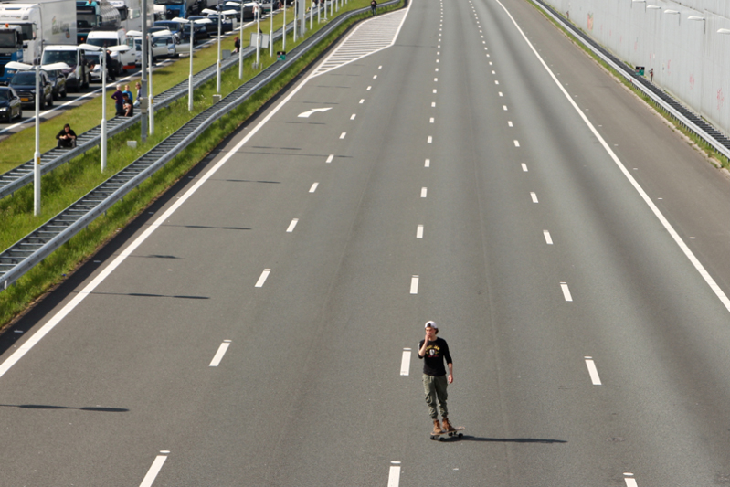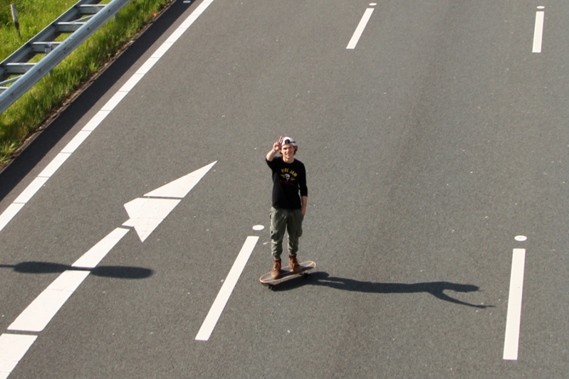 Een skateboarder dacht kort het rijk alleen te hebben en trok een baantje over de lege A4.