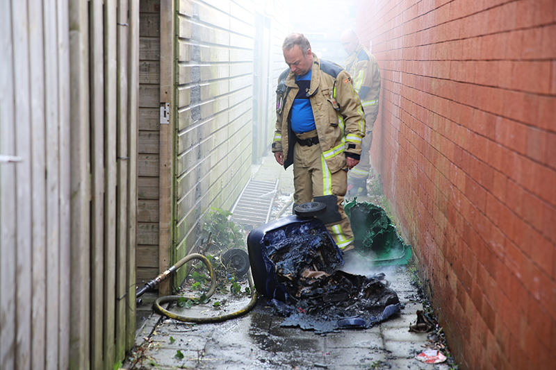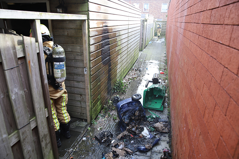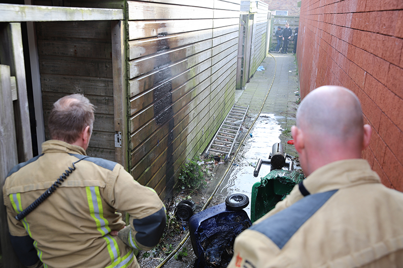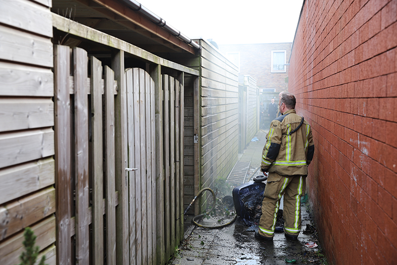 De brandweer van Rijswijk kwam met spoed ter plaatse en begon direct met het blussen van de brandende kliko’s.