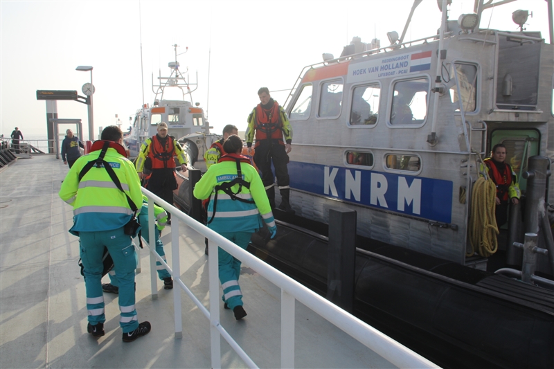 De man is aan boord gestabiliseerd en daar is het hartprobleem geconstateerd. Met de kraan van het schip is de man naar de reddingboot gebracht. De man heeft onderweg naar Hoek van Holland nog een infuus gekregen en er is een schok gegeven om zijn hartritme te verbeteren.