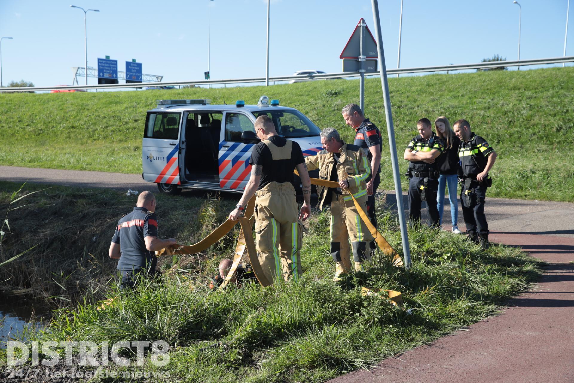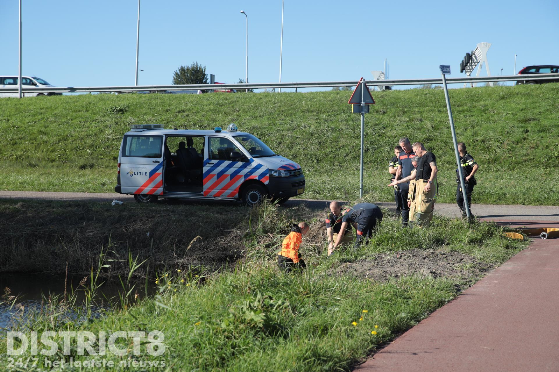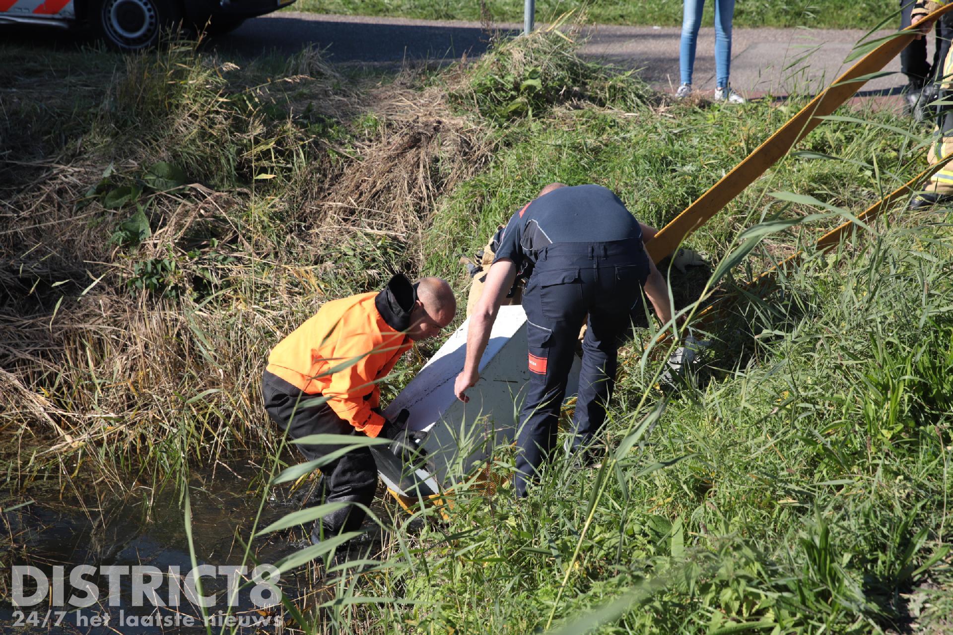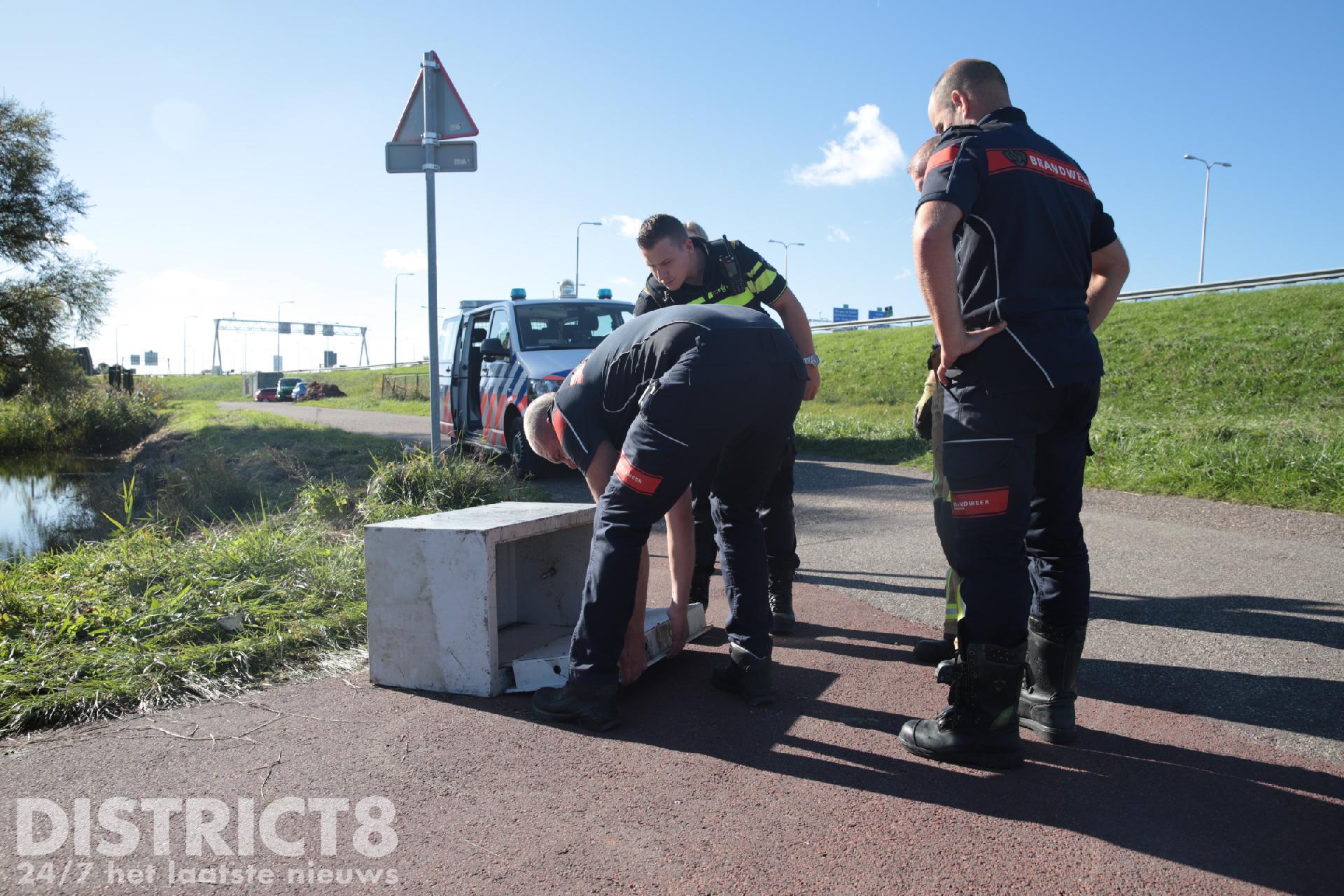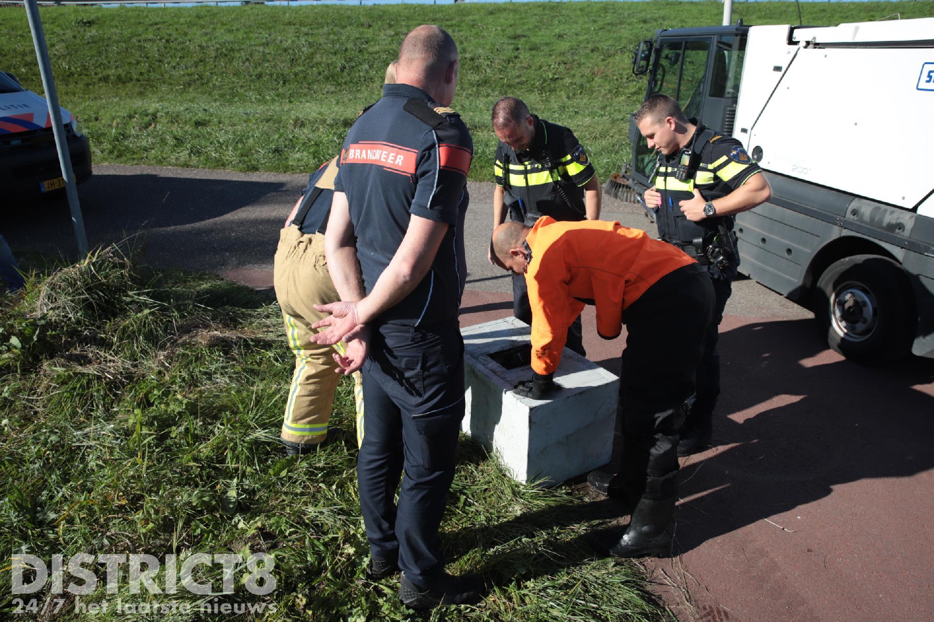 Een brandweerman in een waadpak is het water ingegaan om een slang om de kluis te brengen. Hierna hebben ze de kluis uit het water getrokken.