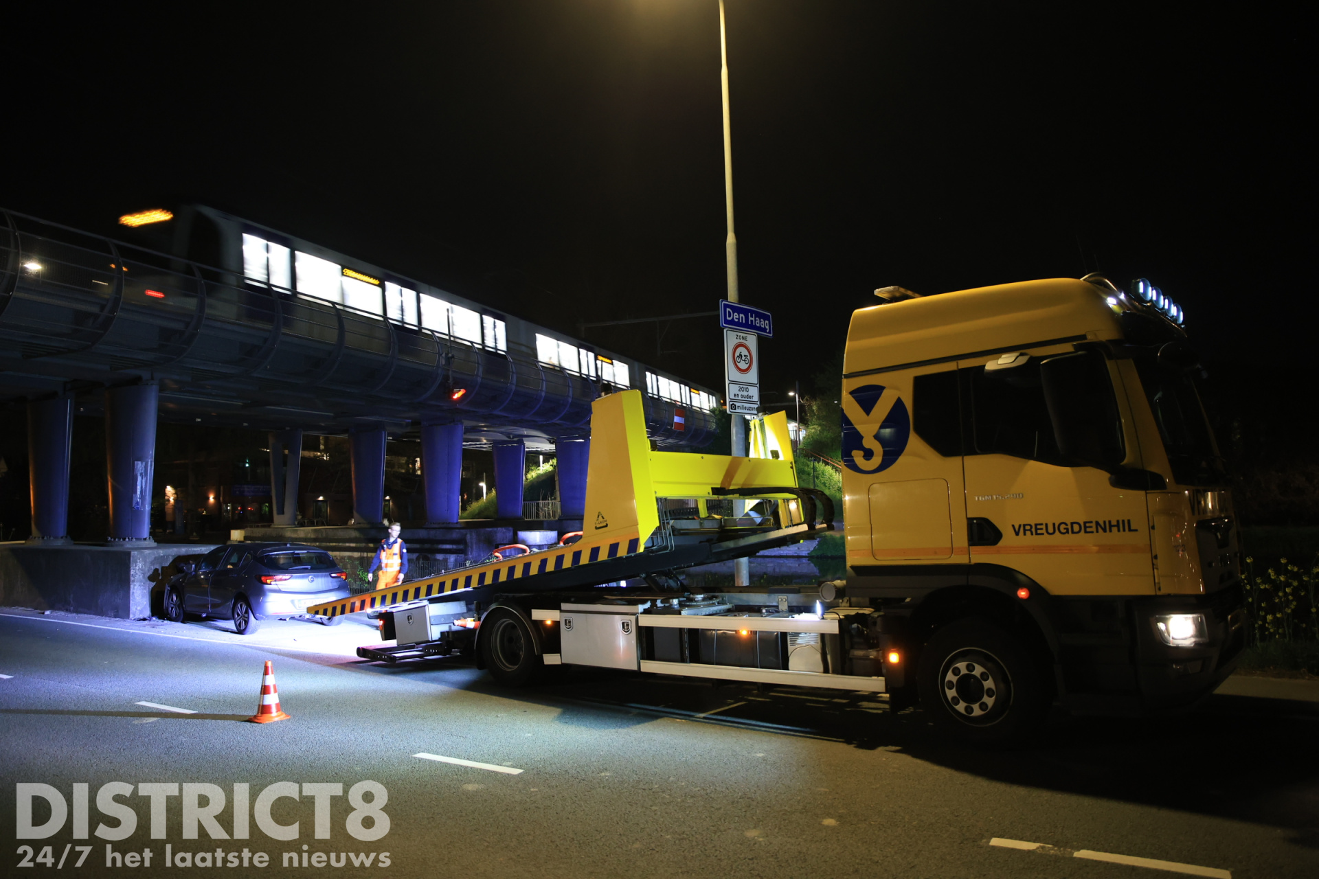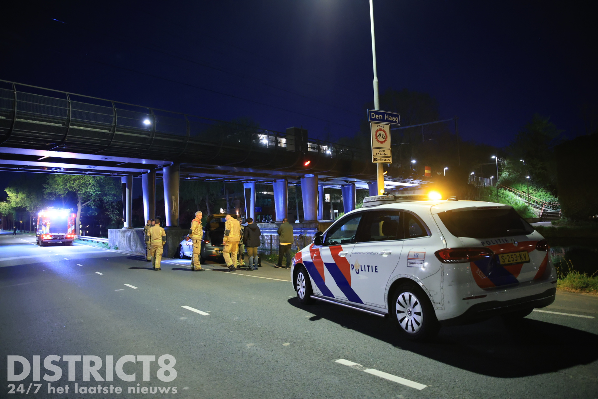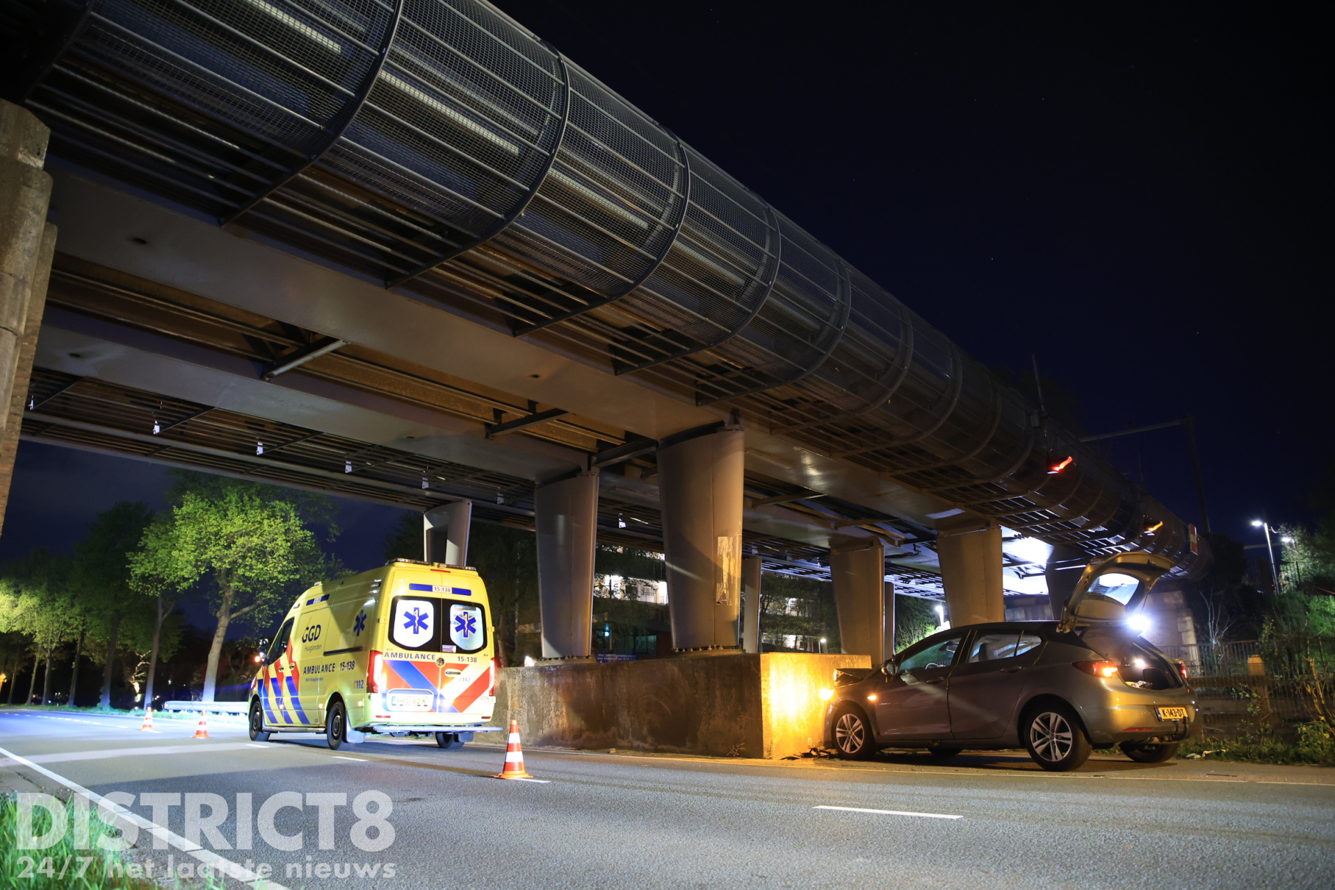Lesauto botst tegen betonnen pijler van brug Westvlietweg Den Haag