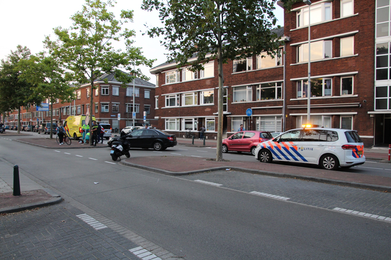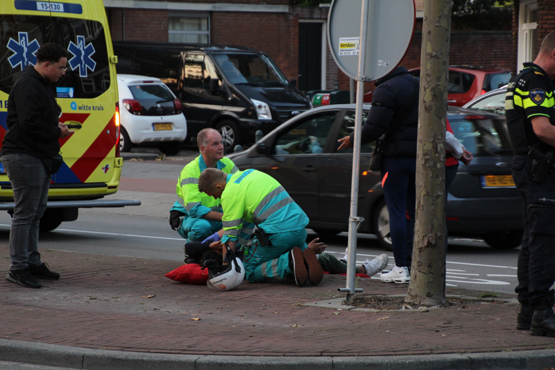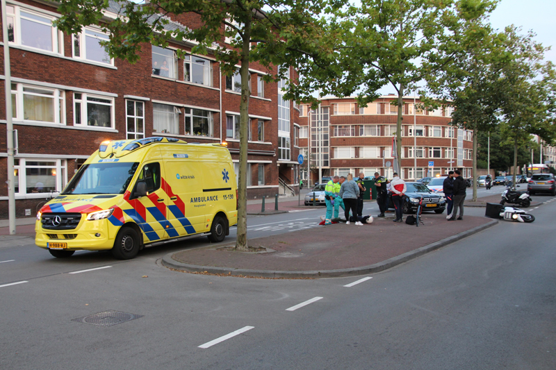 Het personeel van een gealarmeerde ambulance heeft zich ontfermd over de opzittende van de scooter. Na controle van het letsel in de ambulance hoefde de bezorger niet naar het ziekenhuis overgebracht te worden. De politie helpt beide partijen met het invullen van de schadeformulieren.