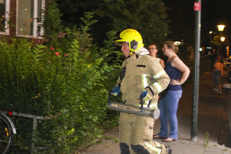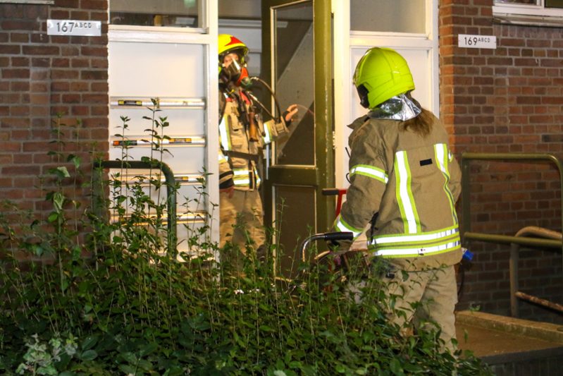 De brandweer had het brandje snel onder controle maar het portiek stond vol rook. Met de rookventilator werd dat uit het portiek geblazen.