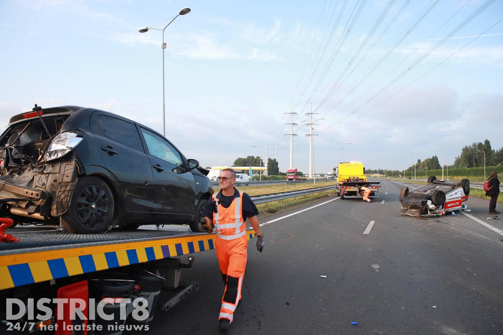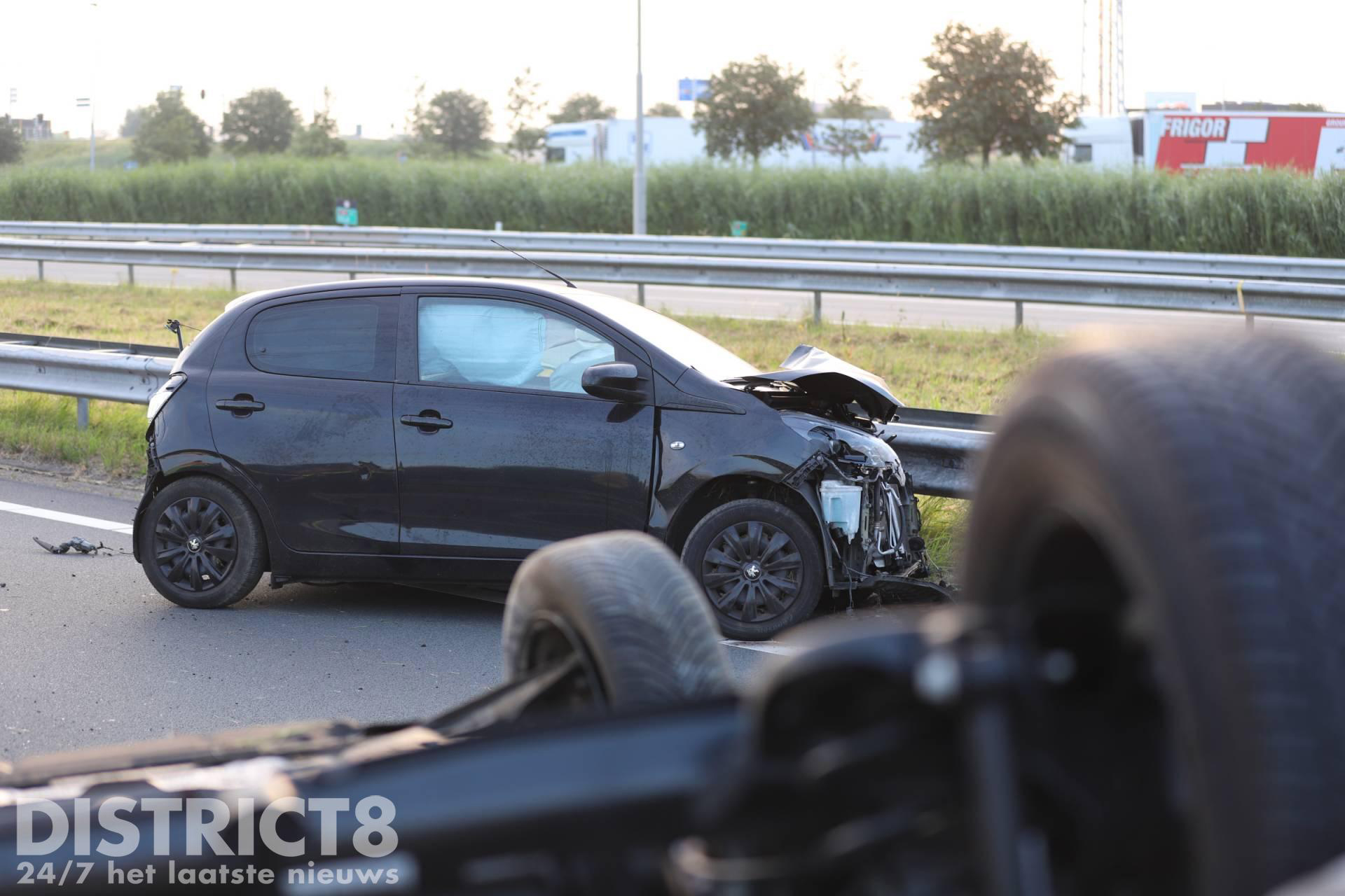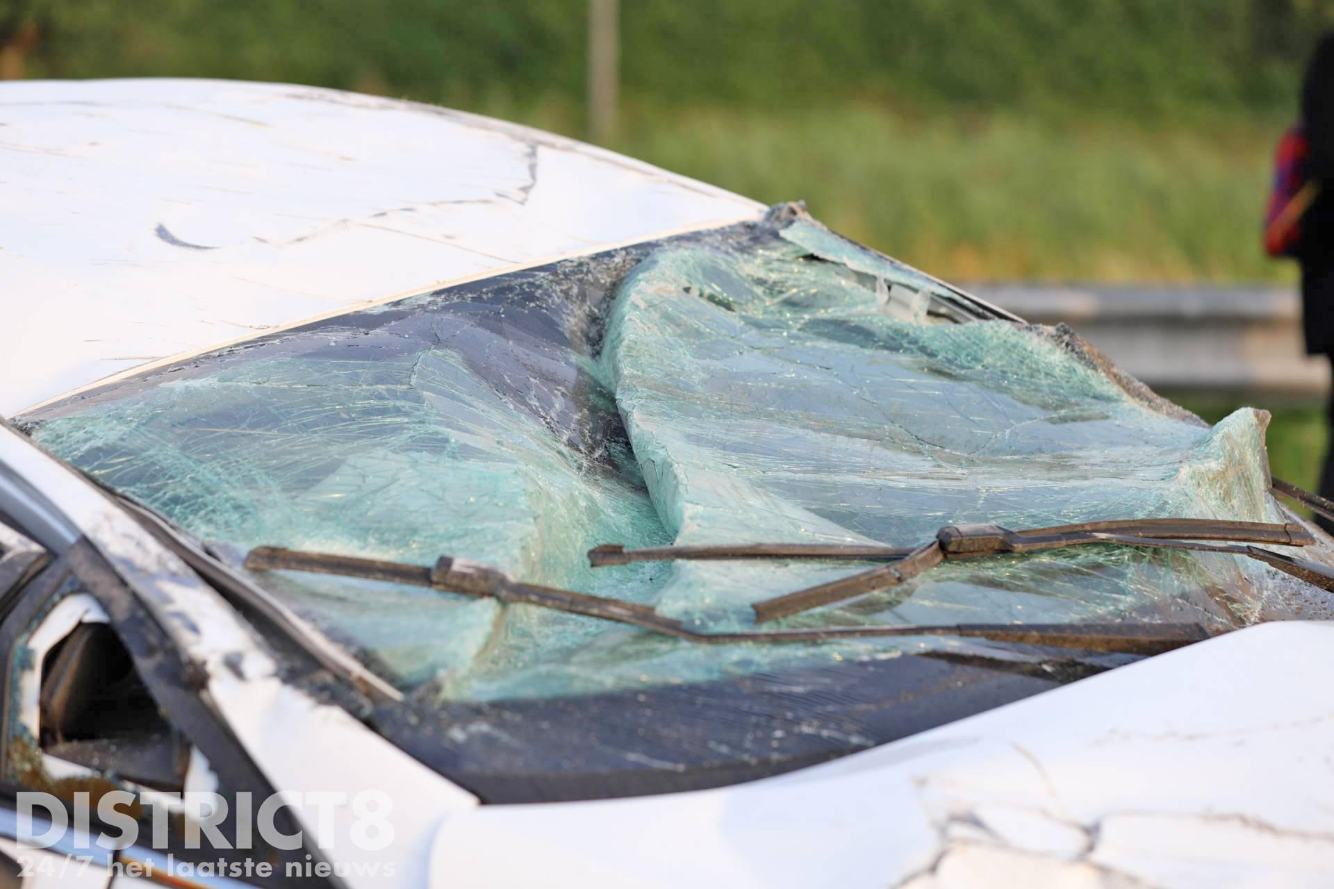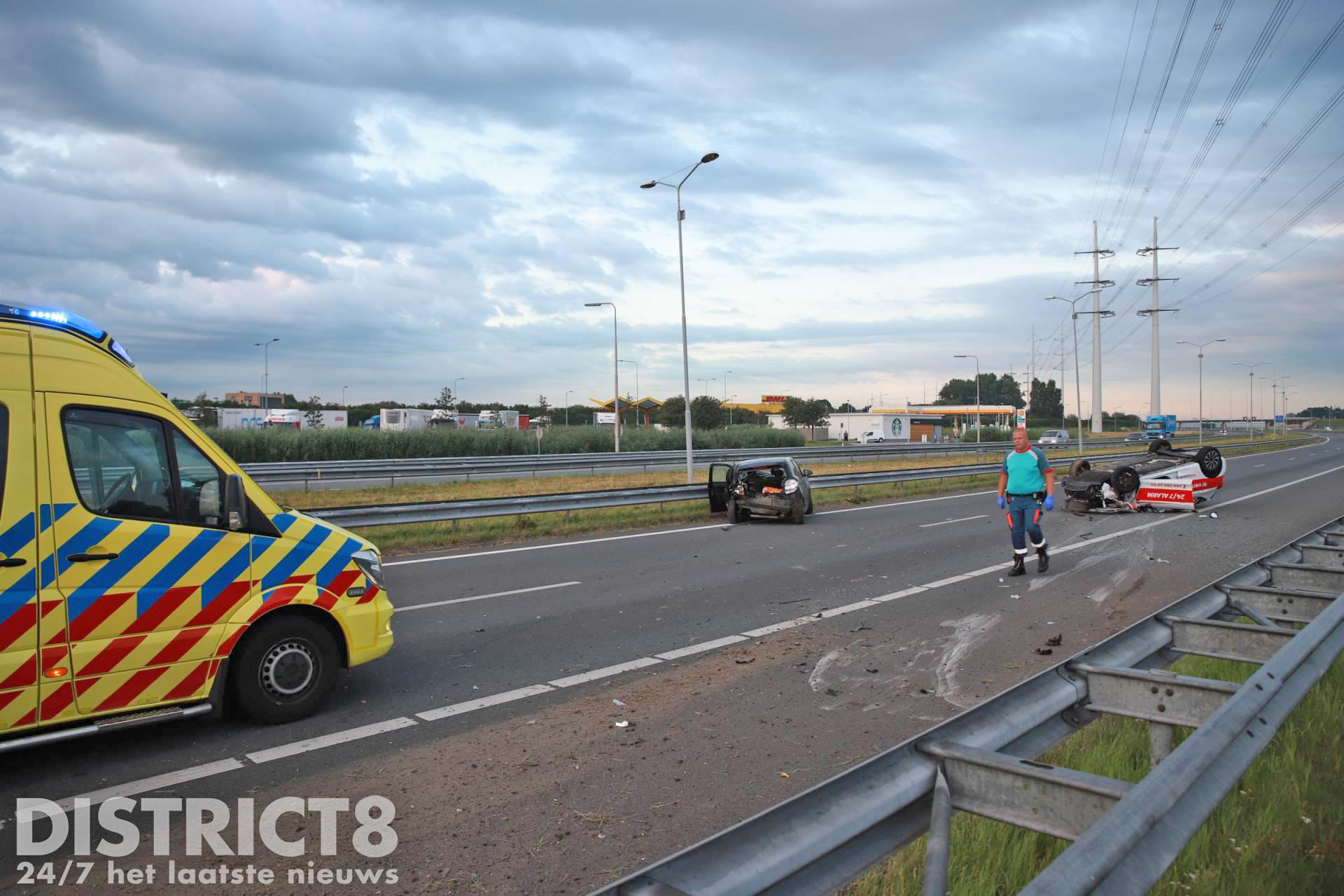 Een van de voertuigen klapte na de aanrijding met hoge snelheid tegen de vangrail waarna de auto over de kop vloog en op z’n dak nog enkele tientallen meters doorschoof. De andere auto kwam met een harde klap tot stilstand in de vangrail aan de andere kant van de weg.