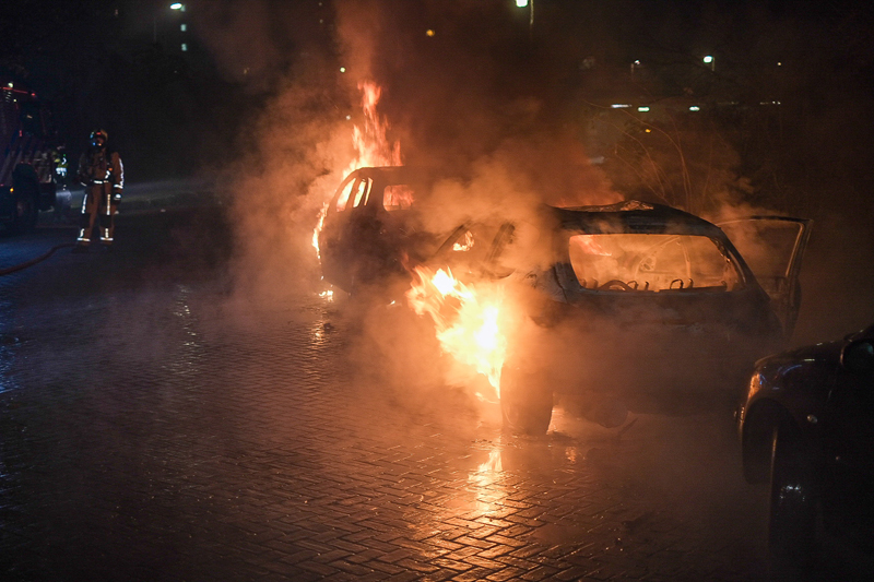 Den Haag – Aan het Heeswijkplein in Den Haag is een auto in brand gestoken. De brandweer kijkt op een afstand toe en overlegt met de politie over de aanpak in verband met de onrust in de wijk.