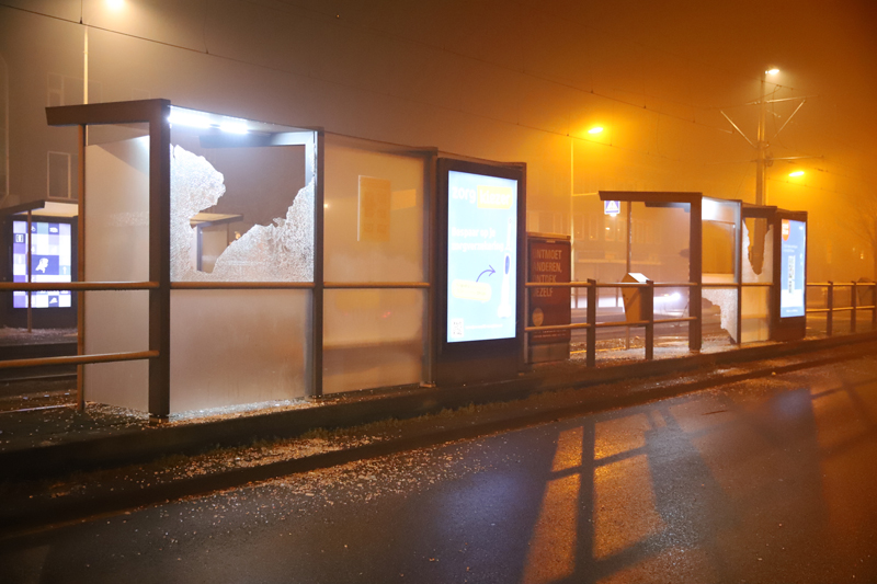 Den Haag – Aan de Tienhovenselaan in Den Haag zijn alle hokjes op de tramhalte vernield door vandalen. Meerdere ruiten zijn gesneuveld en overal liggen flinke hoeveelheden glas op de grond.