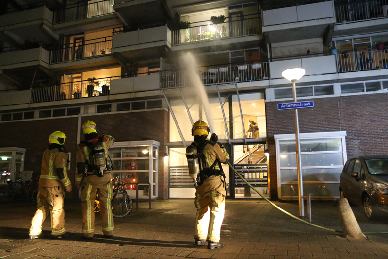 Delft – Aan de Artemisstraat in Delft heeft kort na middernacht op 1 januari een brandje gewoed op een balkon. De brandweer heeft het brandje vanaf de begane grond geblust met een straal hoge druk. Het brandje woedde op een balkon op de eerste etage van een flatgebouw en werd veroorzaakt door vuurwerk wat op het balkon terecht was gekomen.