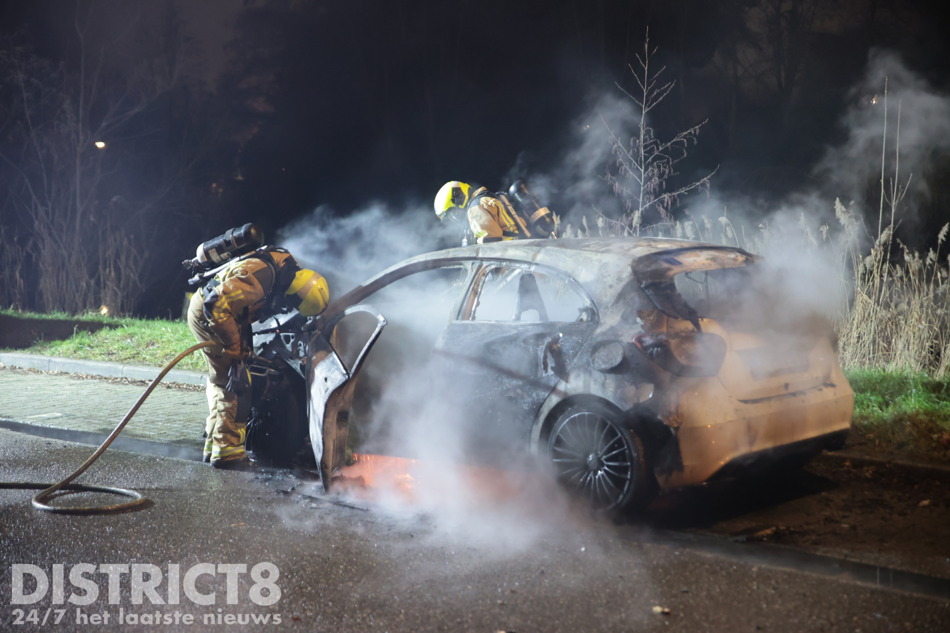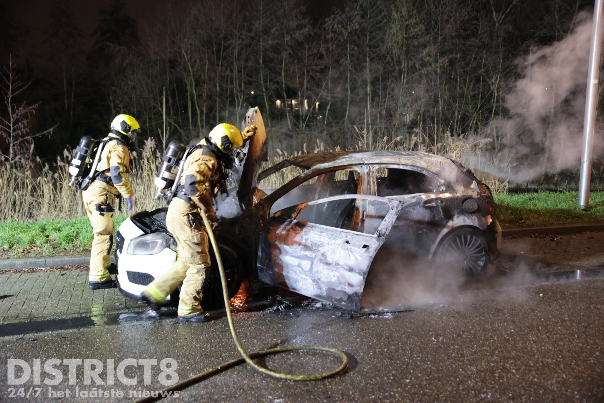 Nootdorp – De Mercedes op het Ambachtshof in Nootdorp heeft opnieuw vlam gevat en de brandweer kwam opnieuw ter plaatse om het voertuig te blussen.