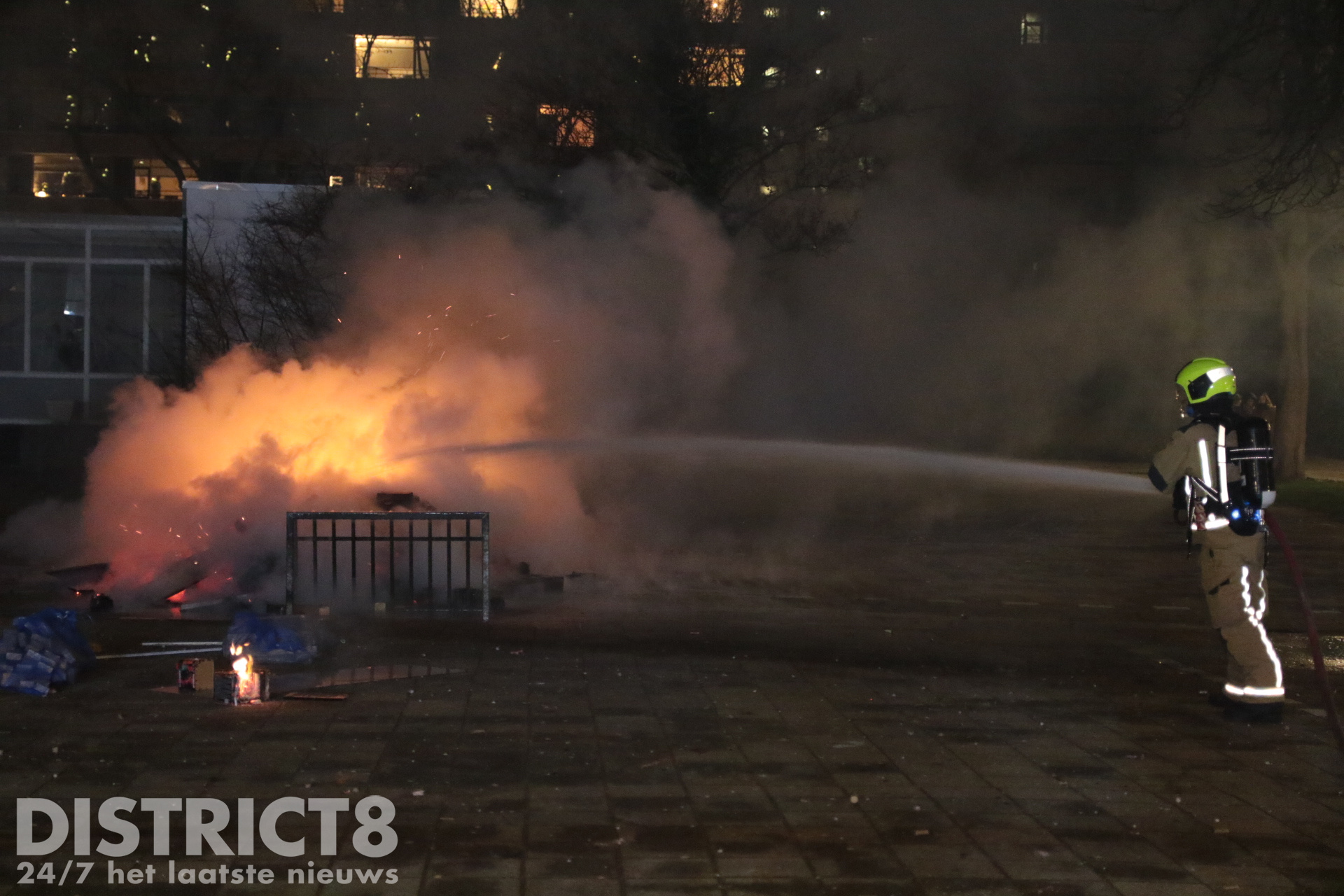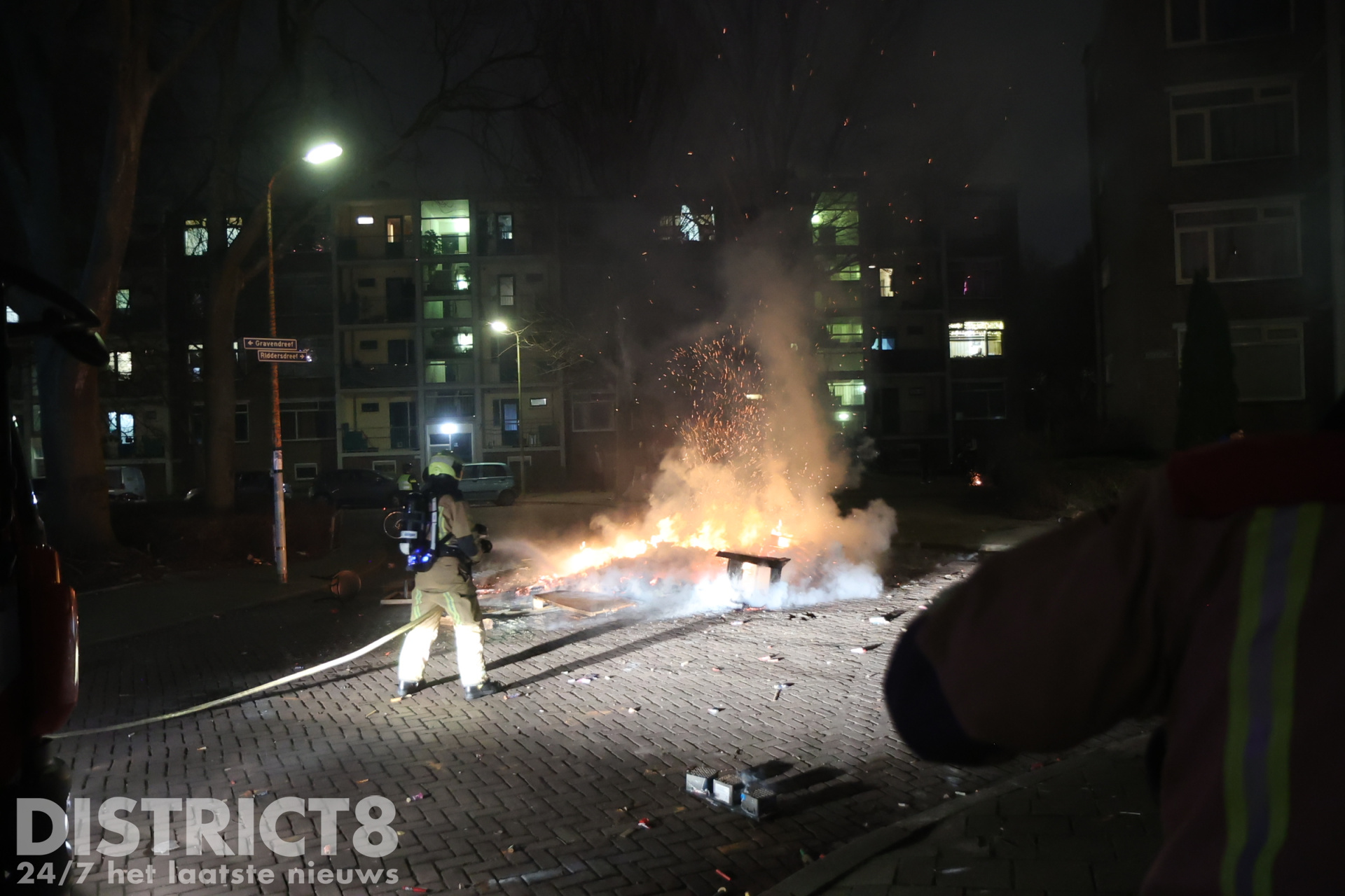 Den Haag – Op de kruising van De Dreef en de Gravendreef werd een grote berg afval op straat in brand gestoken. De brandweer blustte het vuur met een straal hogedruk.