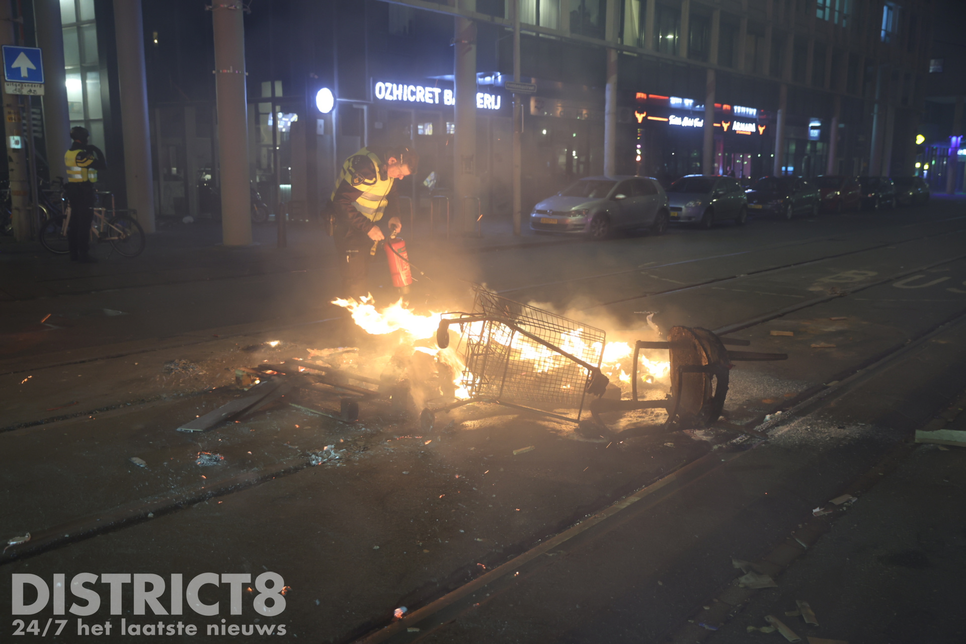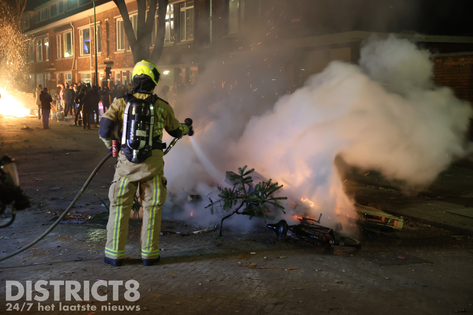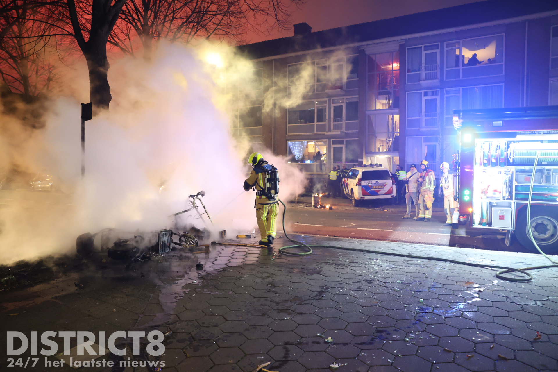 Den Haag – Nadat het al de hele avond onrustig is in de omgeving van de Hobbemastraat in Den Haag, heeft de politie precies rond middernacht een charge uitgevoerd. De groep jeugd was dusdanig groot en met vuurwerk aan het schieten, dat de politie ingreep. Ook waren inmiddels meerdere branden gesticht op straat die door de politie geblust zijn.