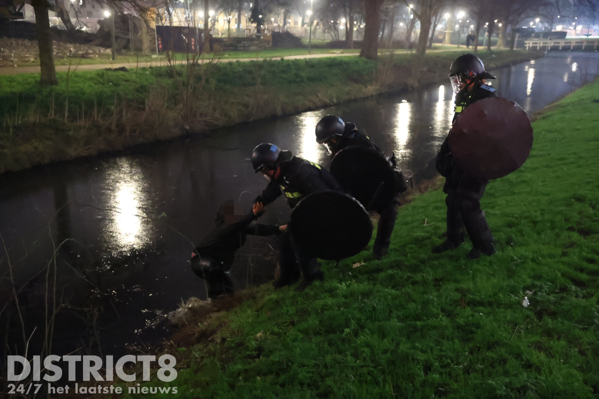 Den Haag – Op De Dreef moest de Mobiele Eenheid (ME) in actie komen om de rust op straat te herstellen. Eén van de jeugdigen die op de vlucht sloeg toen de ME een charge uitvoerde, sprong in een ijskoude sloot. De ME hielp de jongeman weer op het droge en joeg hem daarna alsnog weg.