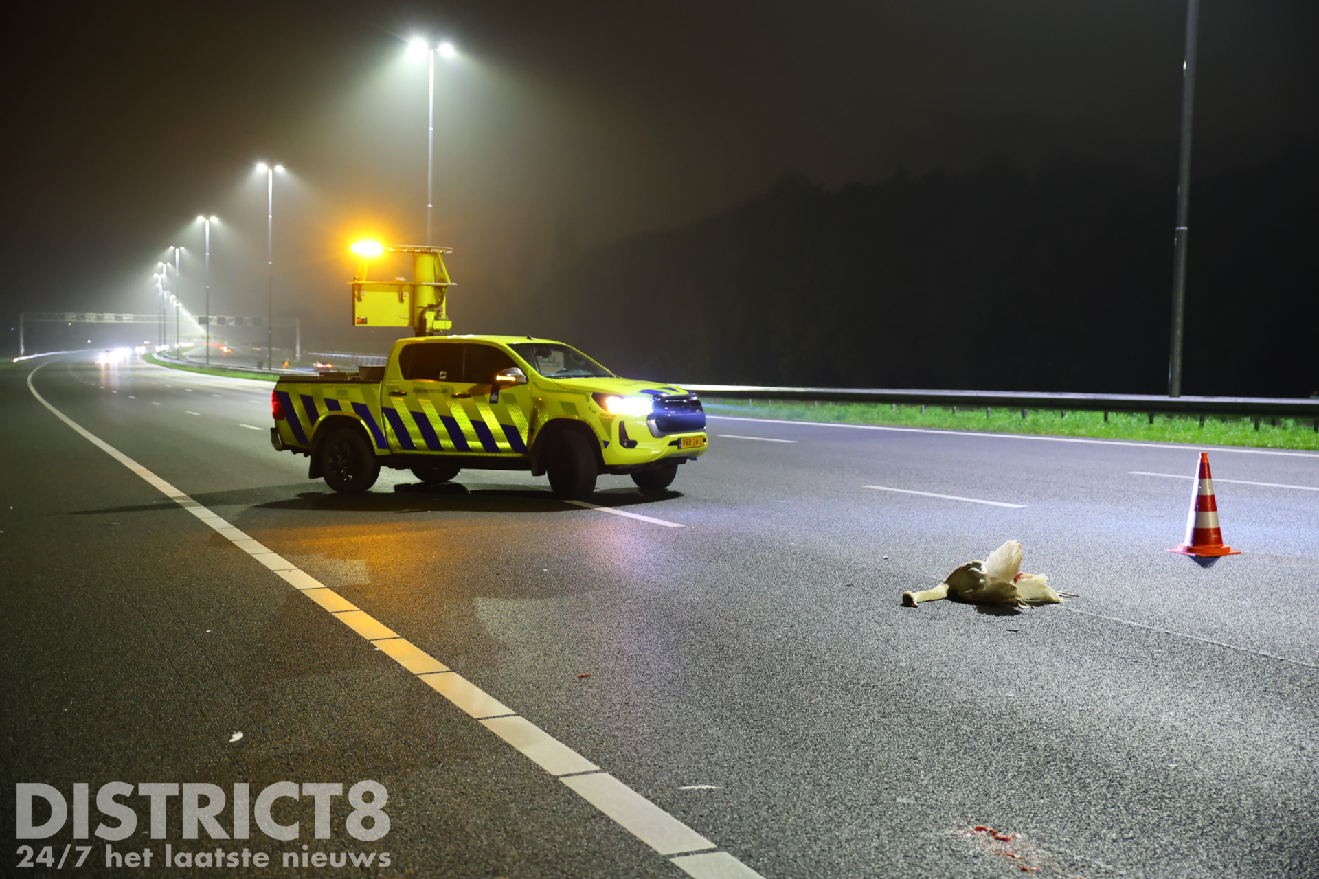 De zwaan overleefde de aanrijding met de auto niet en is meegenomen door Rijkswaterstaat en wordt overgedragen aan de dierenambulance.