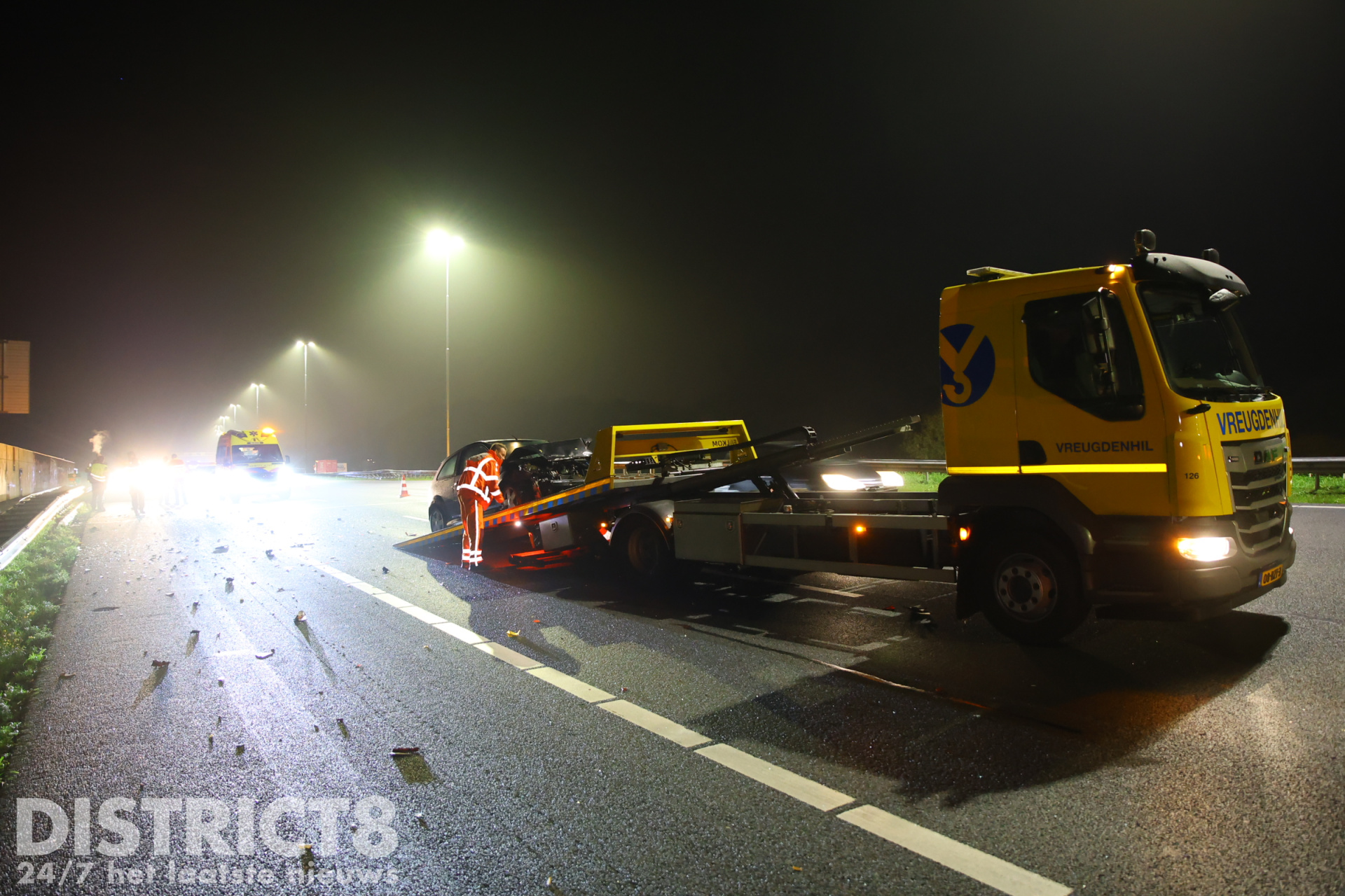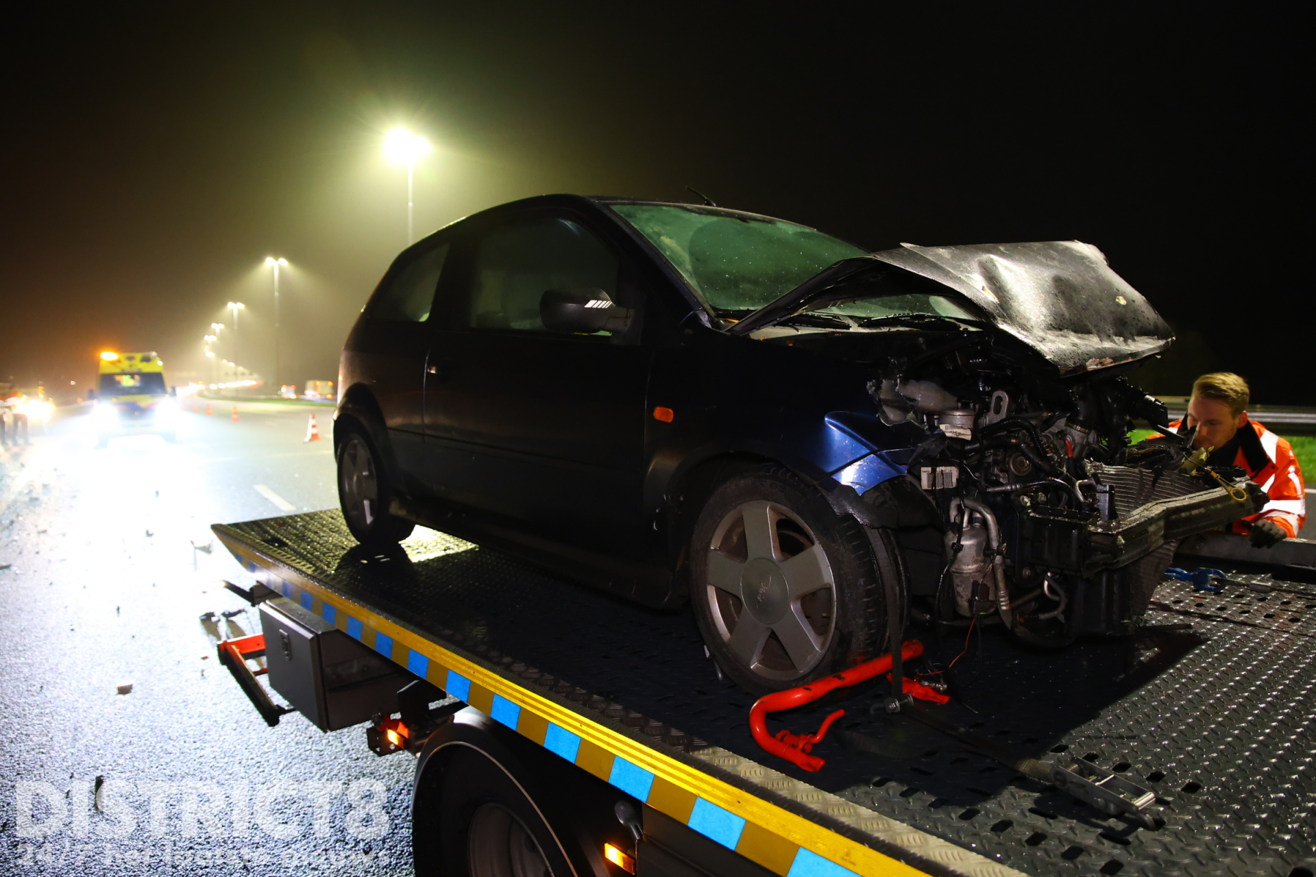 De personenauto heeft veel schade opgelopen. Een berger heeft de auto meegenomen, het reinigen van het wegdek neemt naar verwachting nog enige tijd in beslag. De vangrail wordt na de spits gerepareerd.