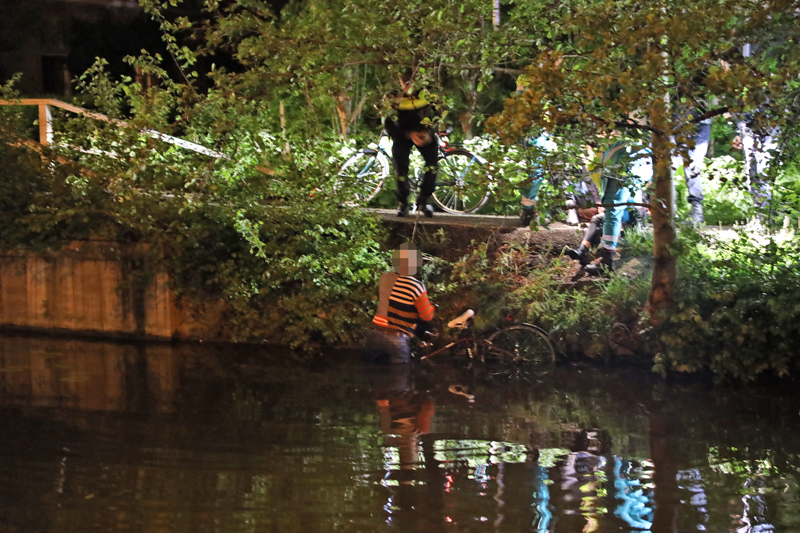 De man is even later met fiets en al door agenten uit het water geholpen, bij de aankomst van de brandweer waren alle personen al uit het water en bleek de inzet van de brandweer niet meer nodig.