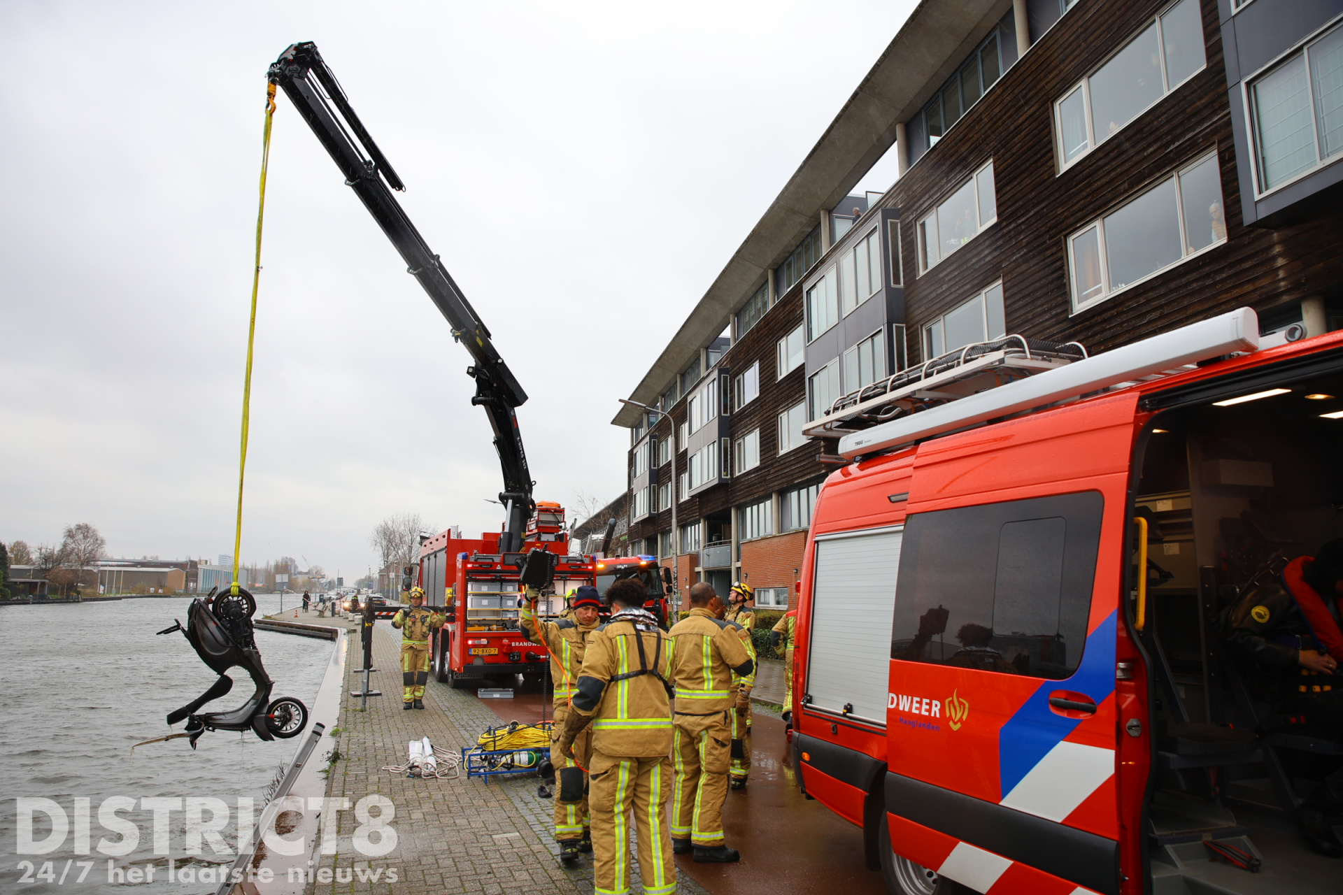 Een duiker heeft in het ijskoude water gezocht en na enige tijd een scooter aangetroffen. Met behulp van de kraan van het hulpverleningsvoertuig van de brandweer is de scooter uit het water gehaald.