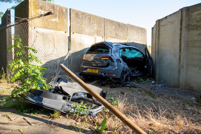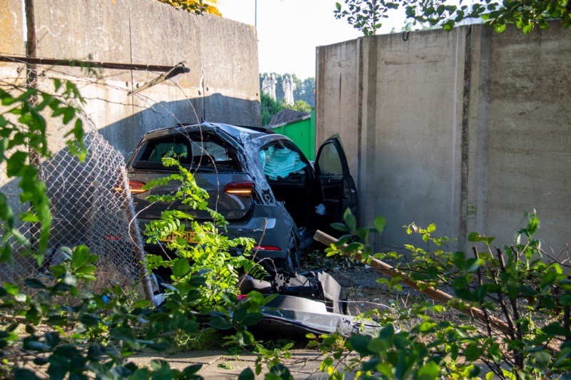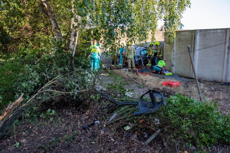 Een auto is een bocht met volle vaart rechtdoor gereden, door de bosjes, door een hek gereden en tegen een betonnen wand tot stilstand gekomen.