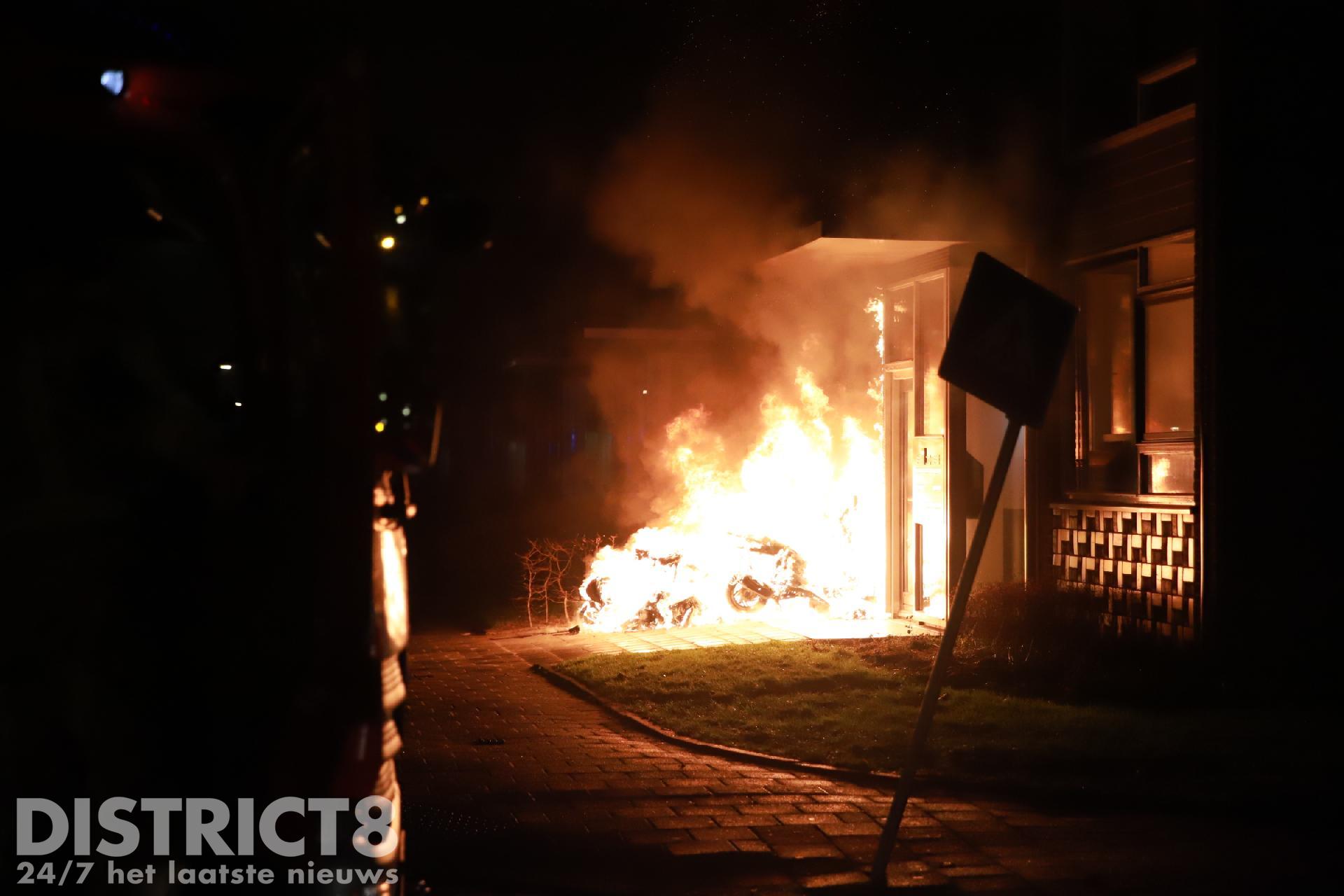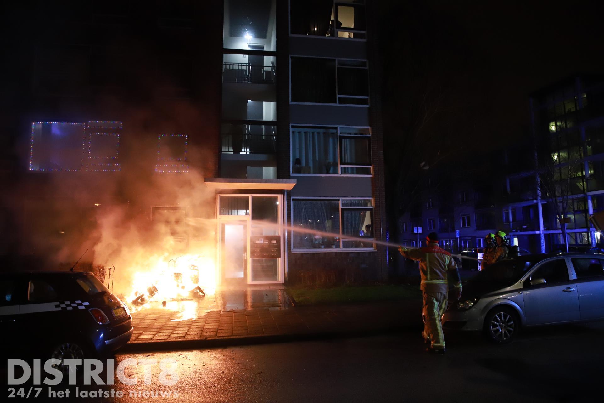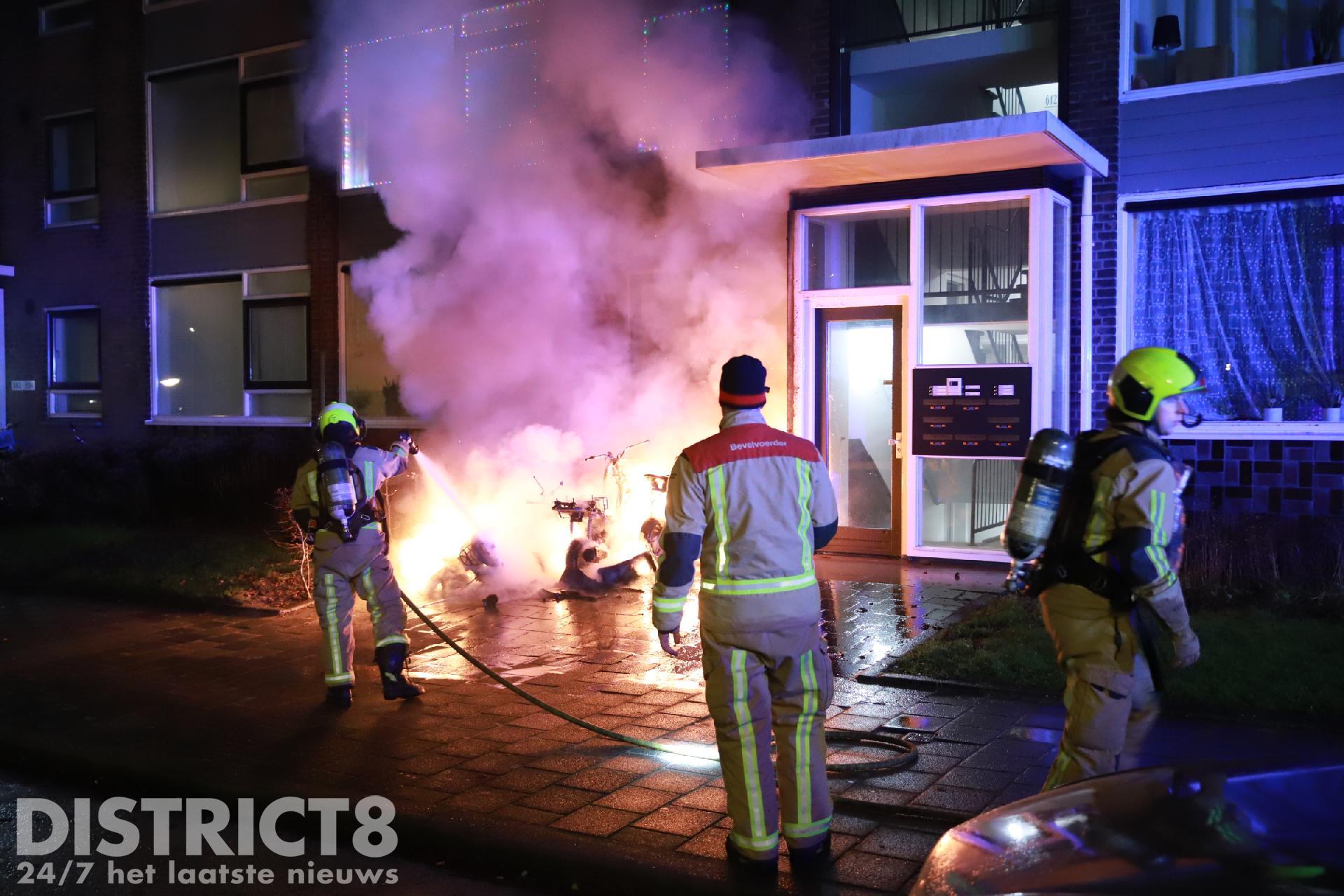 Den Haag – Op de Erasmusweg in Den Haag zijn in de nacht van zaterdag op zondag 25 december drie scooters in vlammen op gegaan, de scooters stonden tegen een portiek aan.