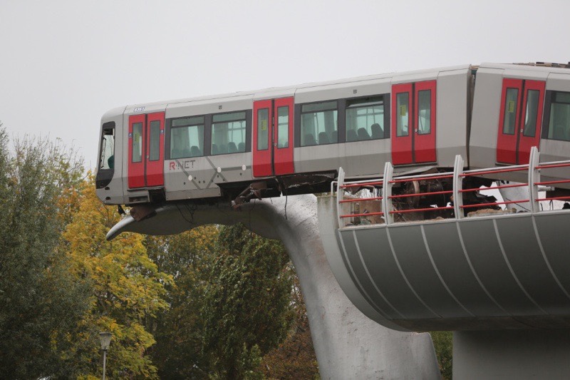 De metro ramde een stootblok en schoot daarna door en bleef meter boven het wegdek hangen ondersteunt door een kunstwerk. Er brak brand uit maar dat was snel geblust. De bestuurder van het metrotoestel kon eigenhandig zijn cabine uitkomen.