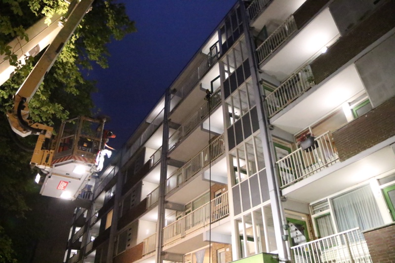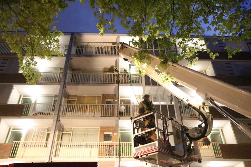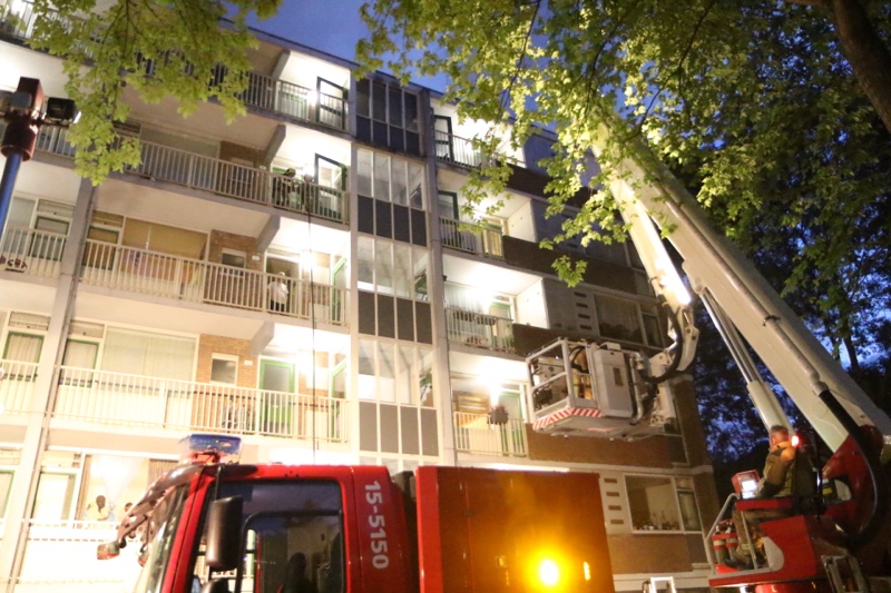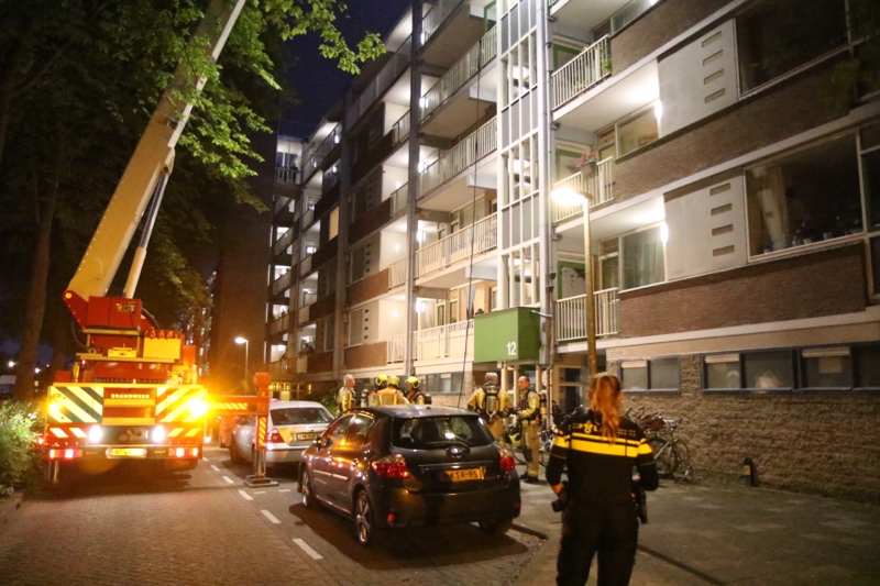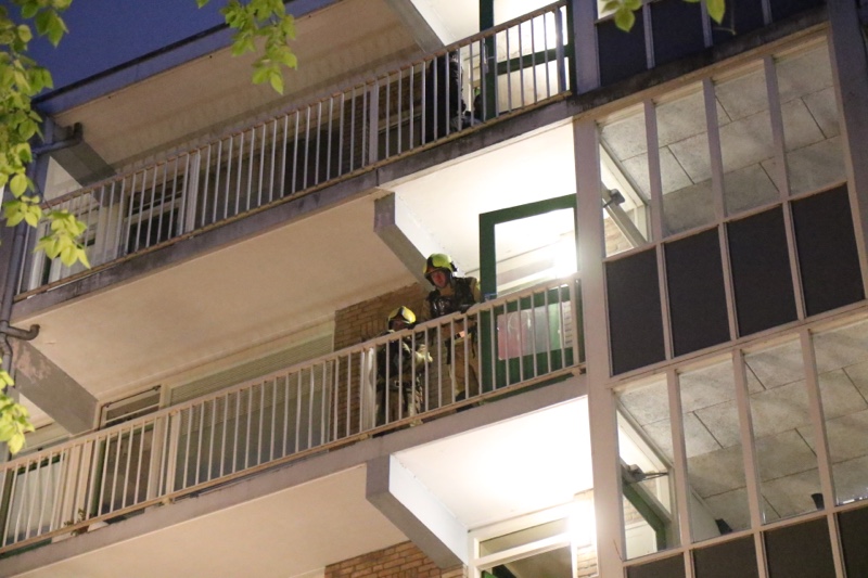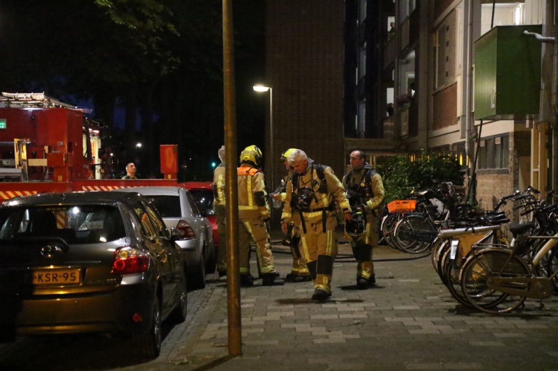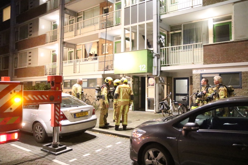 De brandweer schaalde ter plaatse op naar ‘middelbrand’. De brand woedde in het portiek. Bij de brand kwam enige tijd flink wat rook vrij.