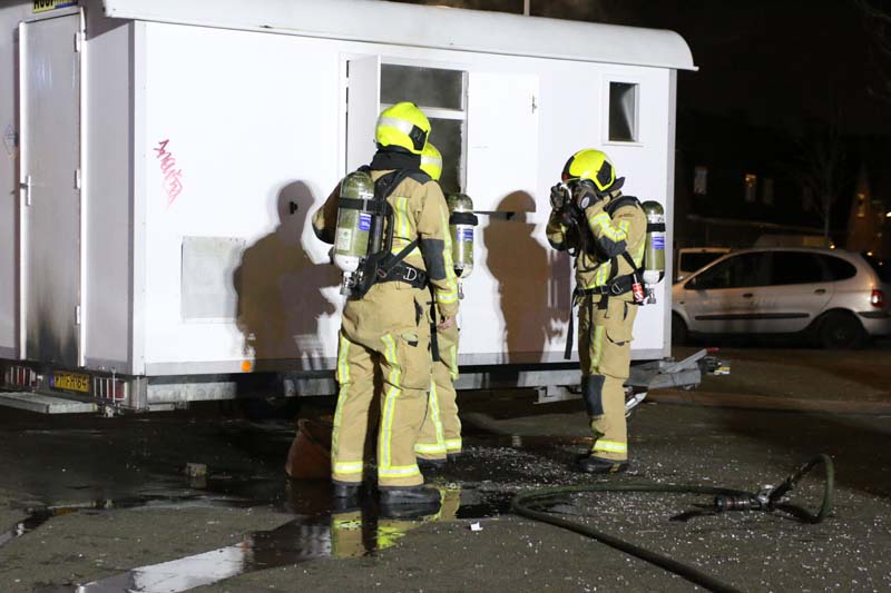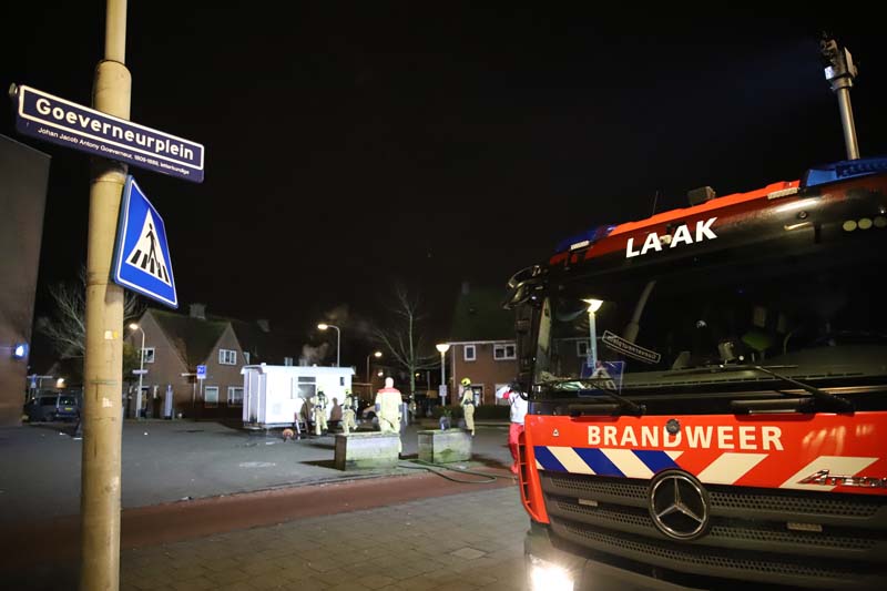 De brandweer kwam met spoed ter plaatse en heeft het brandje snel kunnen blussen. Het glas van de bouwkeet ligt over het Goeverneurplein verspreidt.