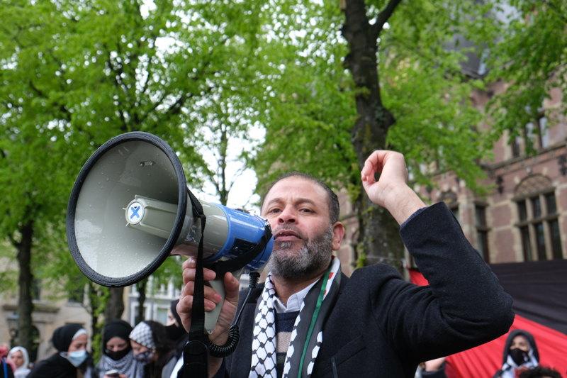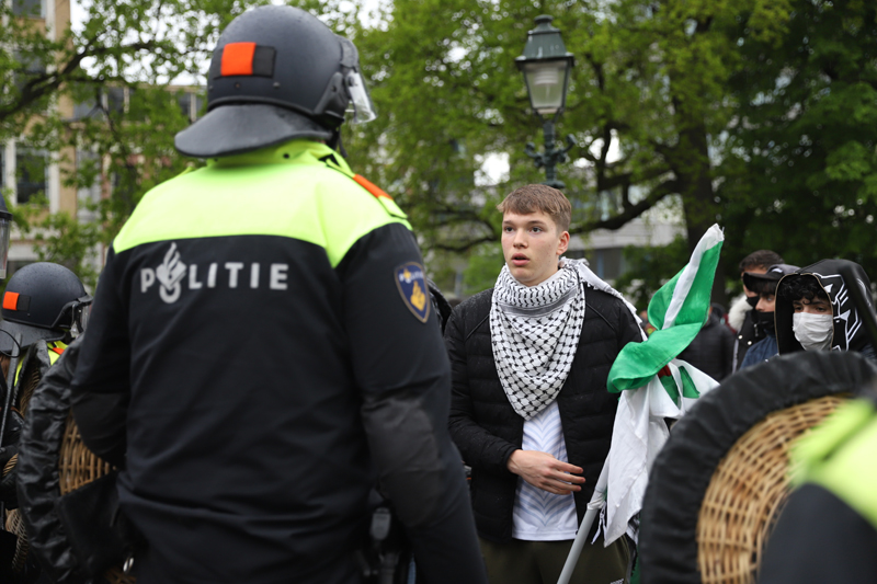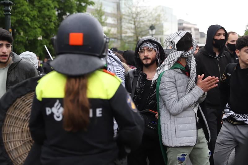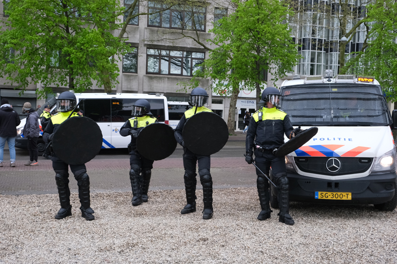 Op het Plein in Den Haag wordt ook gedemonstreerd voor Pro-Palestina. Ook bij deze demonstratie is de politie aanwezig.